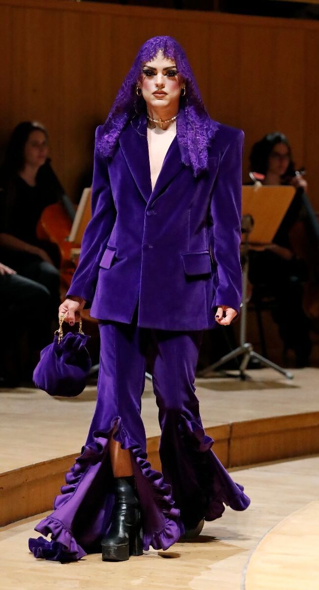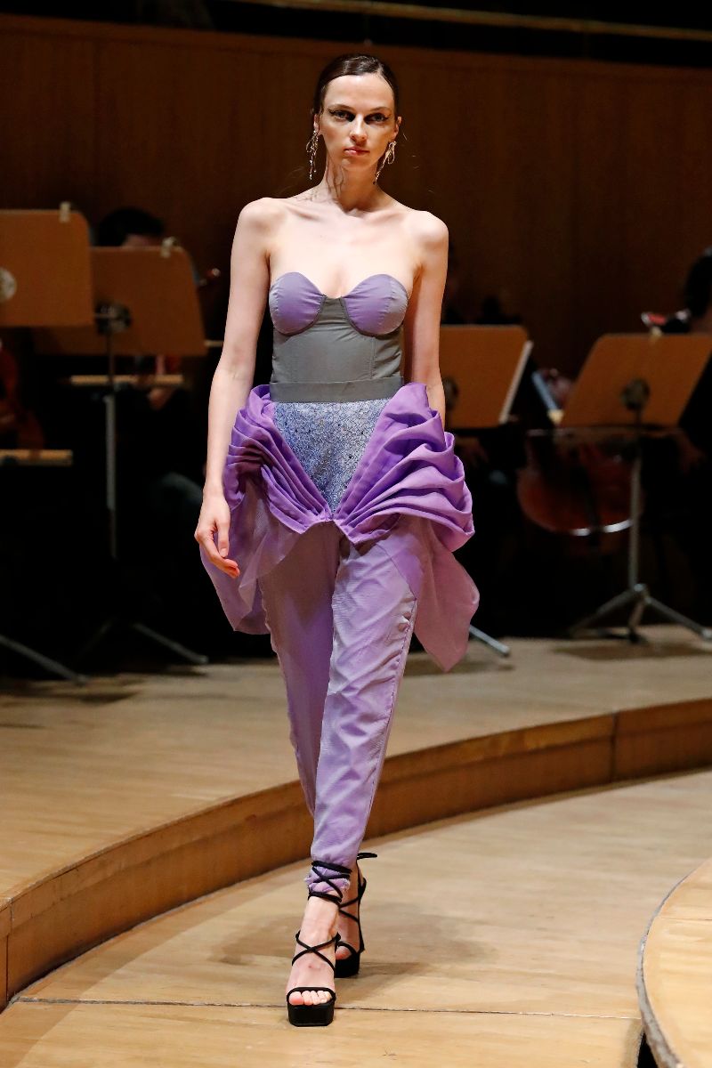 Hacer moda de red carpet no es nada fácil. Jinwen Jiang quedó tercera con su colección basada en el diseño de noche. La diseñadora viste a una mujer atrevida y con ganas de conquistar la calle. Entre las prendas que mostró, la joya de la colección fue un mono violeta con escote corazón y amplias telas en forma de estructura en la cadera.