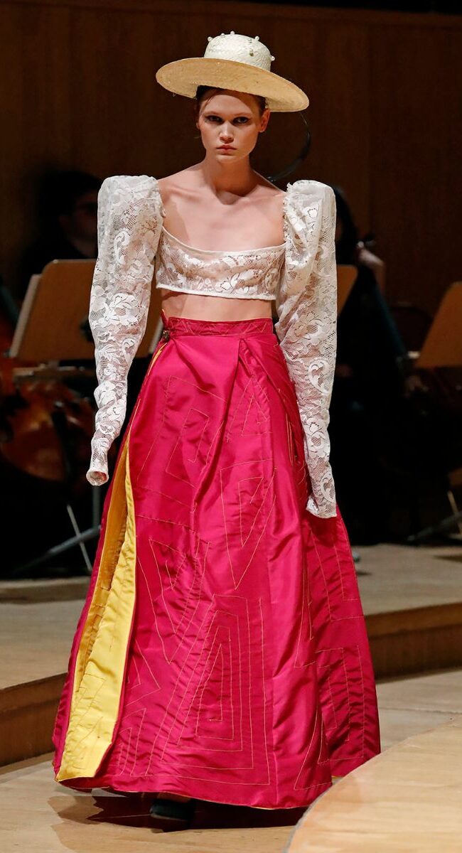 La moda es arte y el mejor ejemplo son las piezas diseñadas por Candela Damas. Mediante la composición de grandes volúmenes y patrones sin reglas, formó unos diseños donde las dimensiones no tienen medida. Tanto el vestido azul eléctrico con flores desde la cabeza hasta la pierna, como la forma geométrica en la prenda en tono rojo, fueron las más llamativas. Es una clara representación de una revolución en el diseño actual.