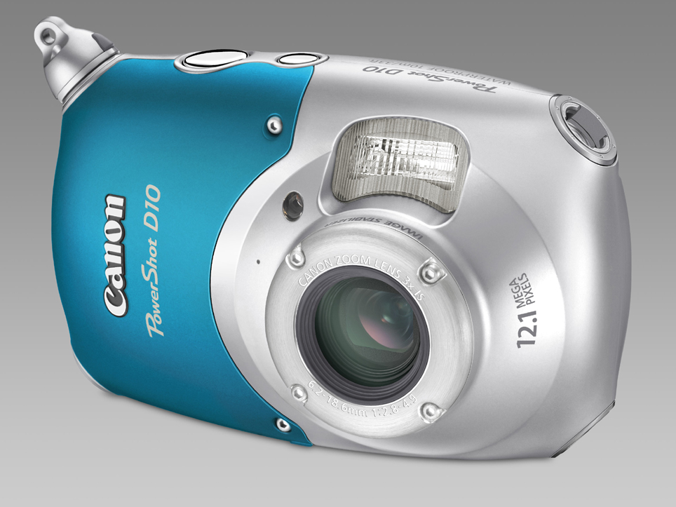 Nueva PowerShot D10. Cámara estanca al agua de 12,1 megapíxeles. Puede sumergirse hasta 10 metros de profundidad y funciona en temperaturas de hasta -10º. Es muy fácil de usar, tiene un zoom óptico 3x y un estabilizador de imagen que evita las imágenes movidas. Dispone de modo automático inteligente con tecnología de detección de escenas, de detección de la cara, corrección automática de ojos rojos… También hace vídeos VGA a 30 fps. Además tienes la opción de retocar las fotos sin necesidad de descargarlas, en la propia cámara. En fin, una cámara de lo más aventurera.