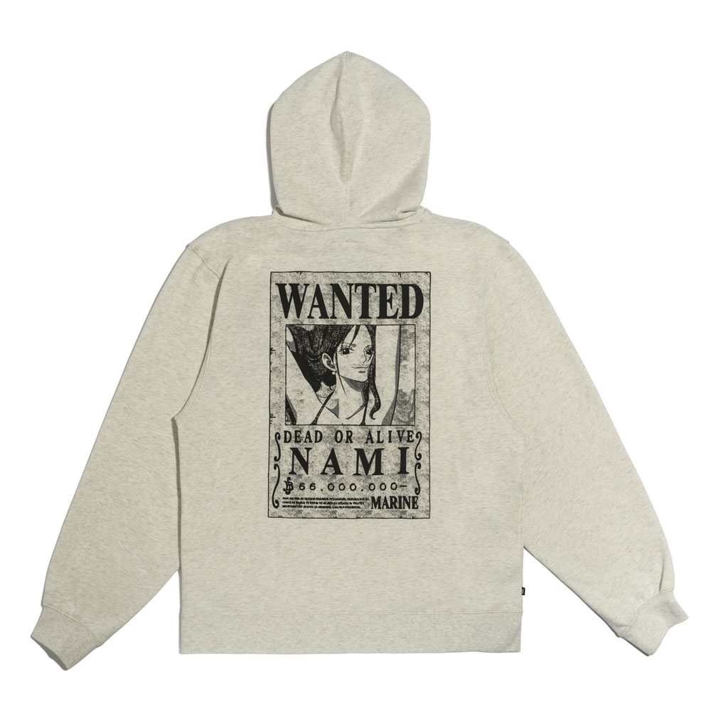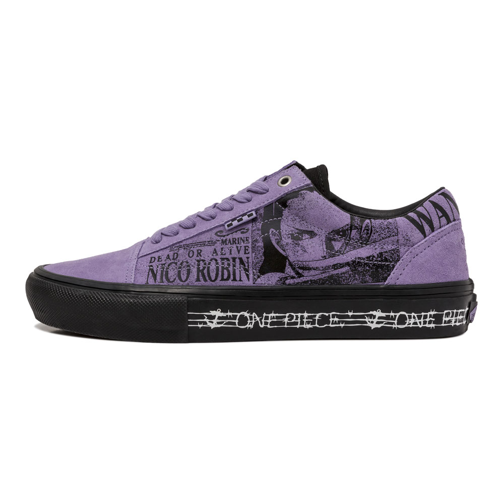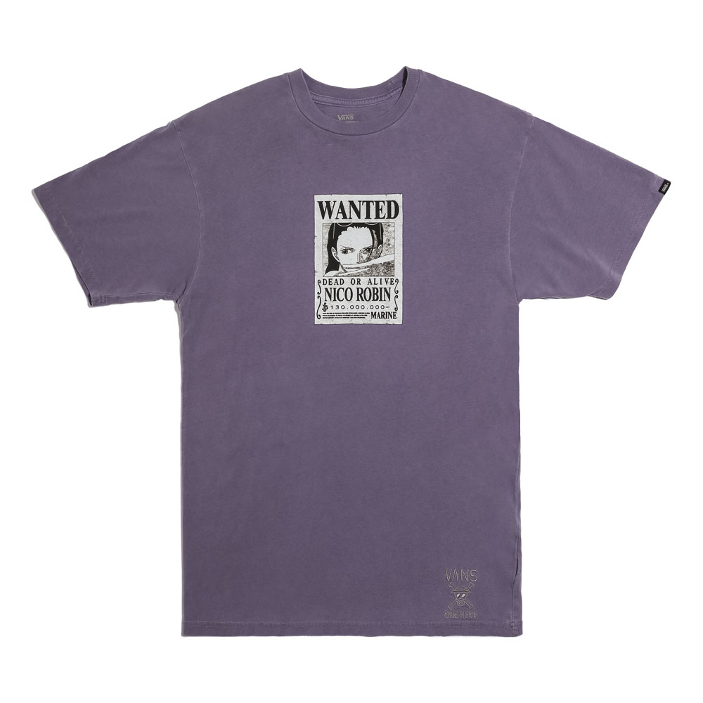 Los tradicionales motivos de la serie, como la versión de la bandera pirata Jolly Roger con sombrero de paja, aparece en múltiples prendas y zapatillas de la colección. Y en las zapatillas Vans Skate Classics vemos, por ejemplo, los reconocibles carteles Wanted. Uno de Nami, la navegante ladrona Cart Burglar, en versión naranja sobre las zapas Skate Sk8-Hi. Y otro de Nico Robin, la arqueóloga pirata Demon Child, en versión morado en las zapatillas Skate Old Skool.