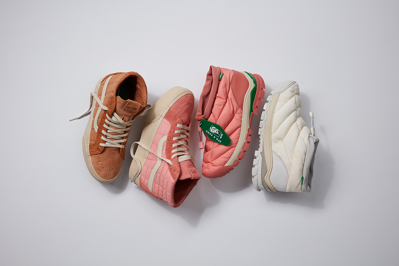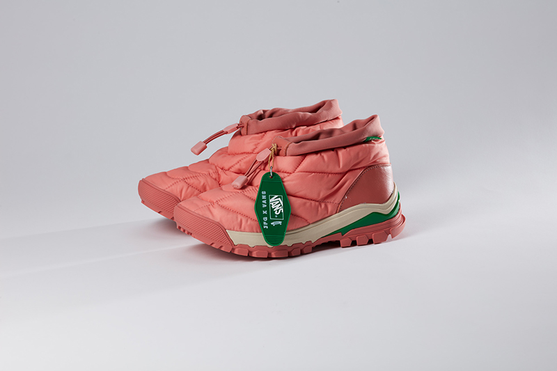 ¿Os habíais creído que una colabo de Vans no tendría zapatillas? Para esta colección junto a Joe Freshgoods, Vans ha decidido dejarle intervenir una de sus más icónicas siluetas: la Sk8-Hi Reissue Platform VLT LX. Estas versiones vienen con un cuerpo en material acolchado, para ir a juego con el puffer con detalles en ante y tienen una suela de plataforma, para ese look retro. La colección ofrece esta icónica zapatilla en coral y en camel.