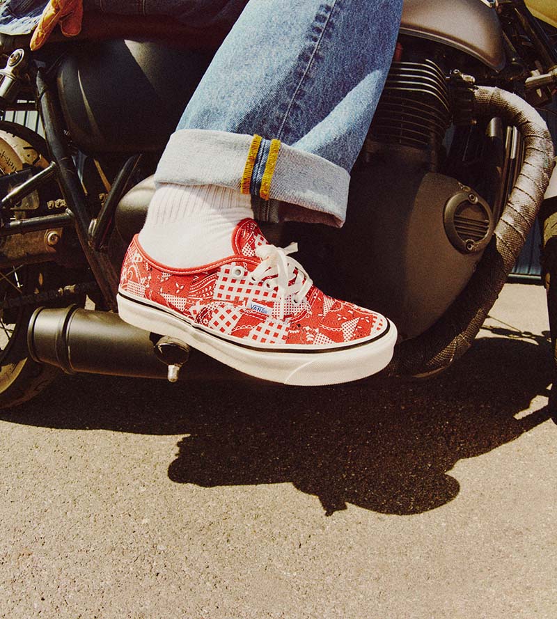 Pero, ¿qué es esto de paninari? Pues fue una moda que petó en Italia durante la década de los 80 impulsada por la llegada de la televisión americana al país. Obsesionados por el consumismo y el estilo de vida americano, los jóvenes de las clases más pudientes comenzaron a llevar cada vez más y más marcas americanas… y claro, nombres como Timberland y Vans eran sus siluetas de calzado preferidas. WP Lavori In Corso fue la encargada de suplir a esta nueva tribu urbana pija su dosis de zapatillas traídas directamente de los EEUU. Y de esta relación, a parte de una línea directa al mercado italiano para Vans, surgieron algunos modelos en exclusiva… como en muchos casos de importación; patrones patchwork de bandana son las estrellas de la colabo Vans X Lavori In Corso de estilo (neo) paninari rescatados de aquellos primeros modelos en conjunto.