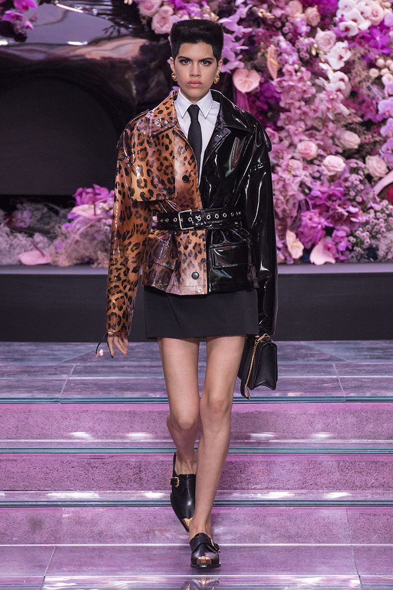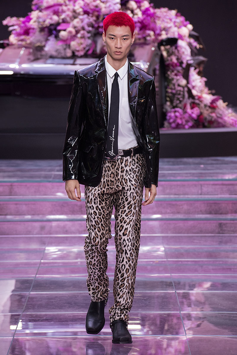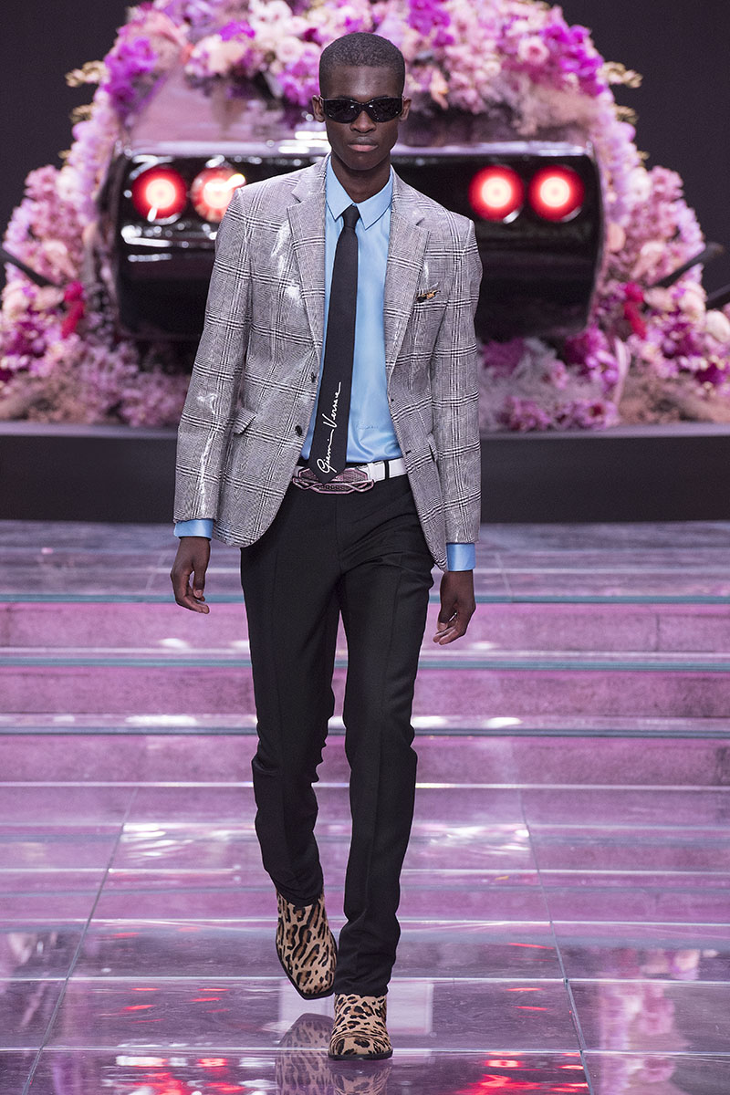 El traje masculino tradicional se reinterpreta mediante nuevas siluetas y telas para hacer aún más evidente el mensaje que intenta transmitir la nueva colección de Versace Menswear primavera/verano 2020. Las chaquetas de traje cruzadas hacen homenaje al ADN de la casa contrastando el negro sólido con estampados de animal print y Principe de Gales.