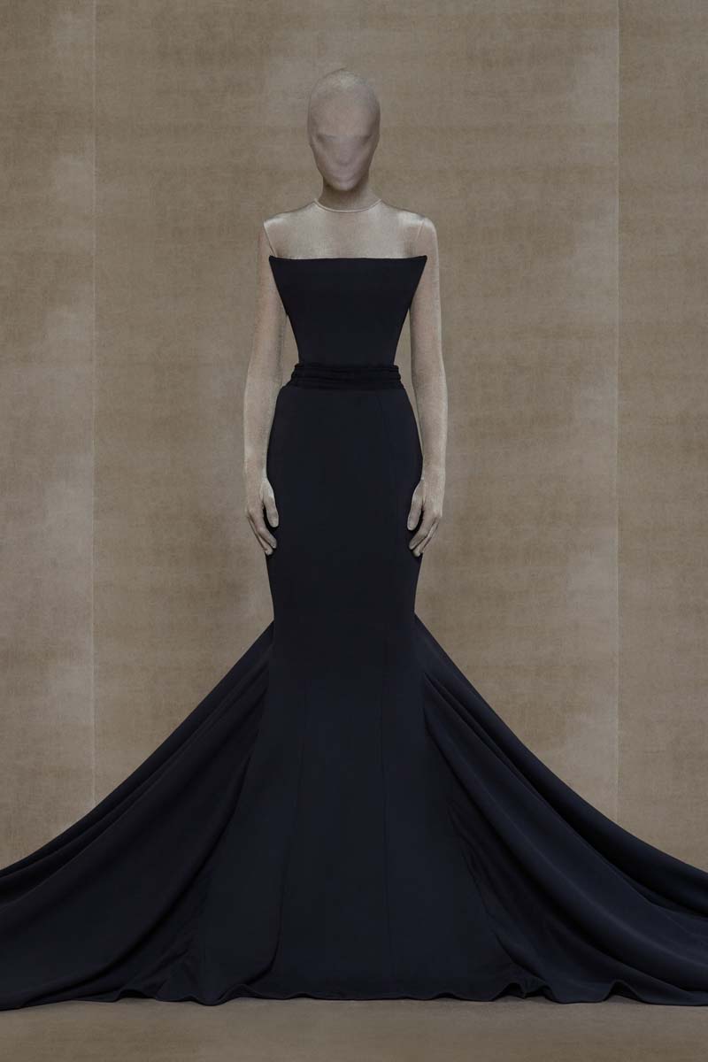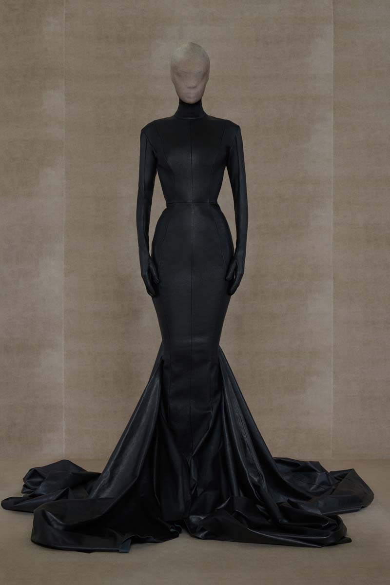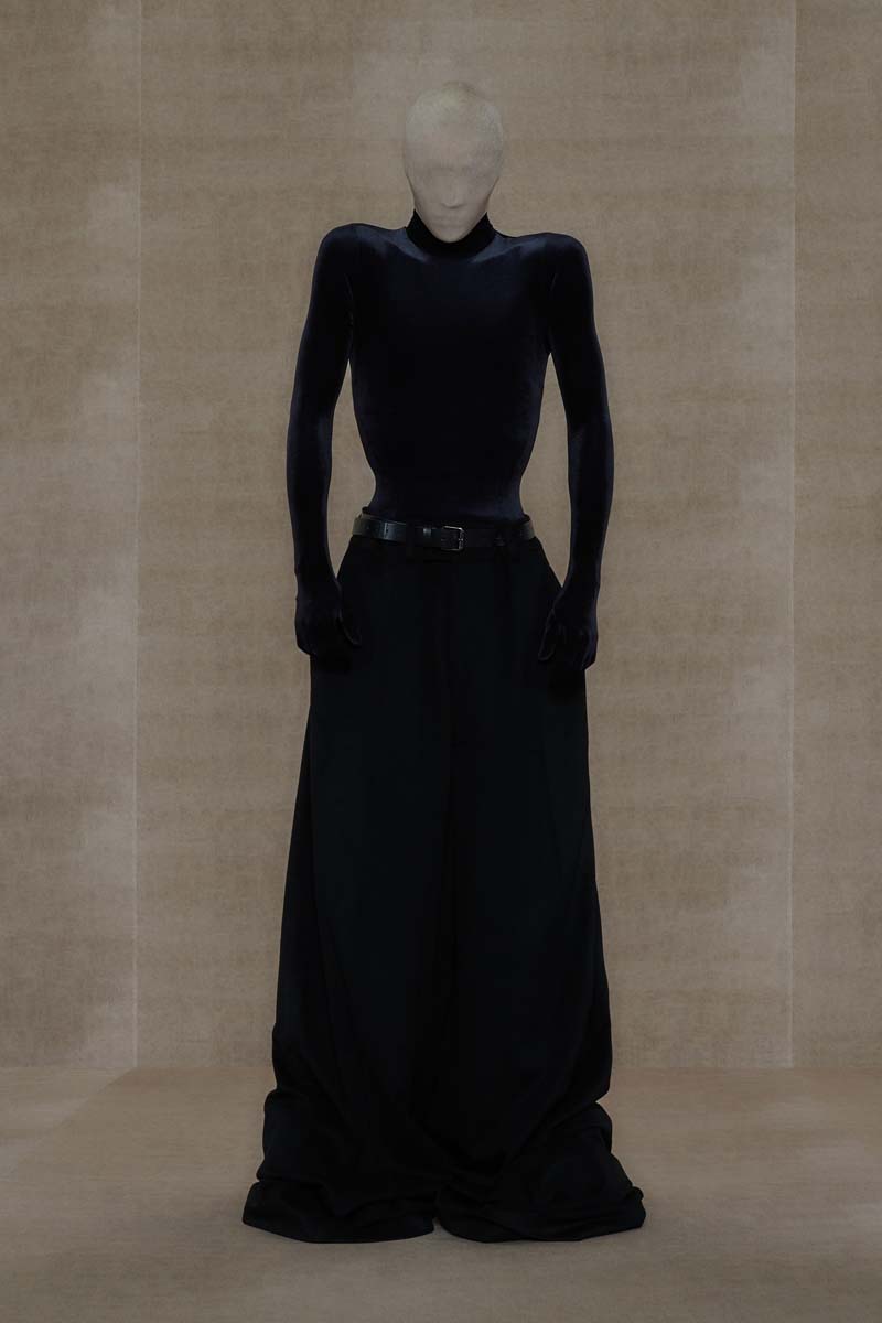 La magia de Vetements, y especialmente SS24, reside en las proporciones y siluetas de sus prendas. La colección abre con conjuntos de alta costura extremadamente ceñidos; un vestido de cola y un body masculino en color champán… Ambos conjuntos están adornados con branding de Vetements Haute Couture, adelantando todo lo que se viene. Siluetas prestadas (o inspiradas en) la colección de Demna se dejan ver en un vestido negro de hombreras redondeadas y una camisa de botones construida para que parezca que está siendo azotada por el viento… que nadie ponga en duda que estos dos son hermanos.