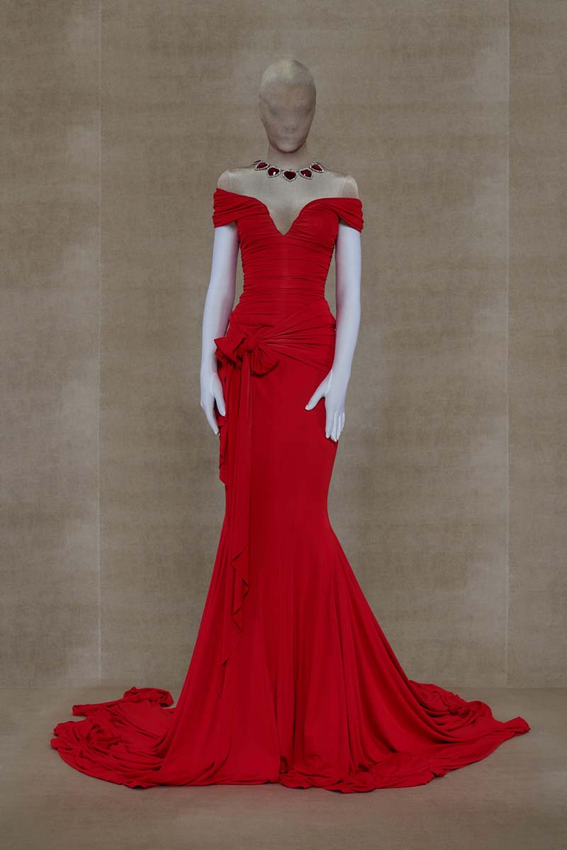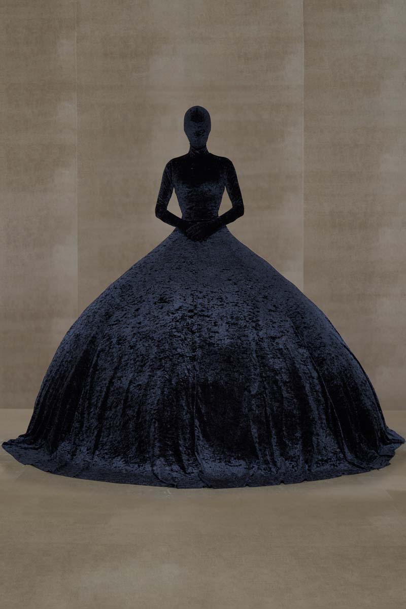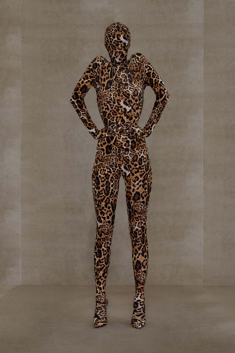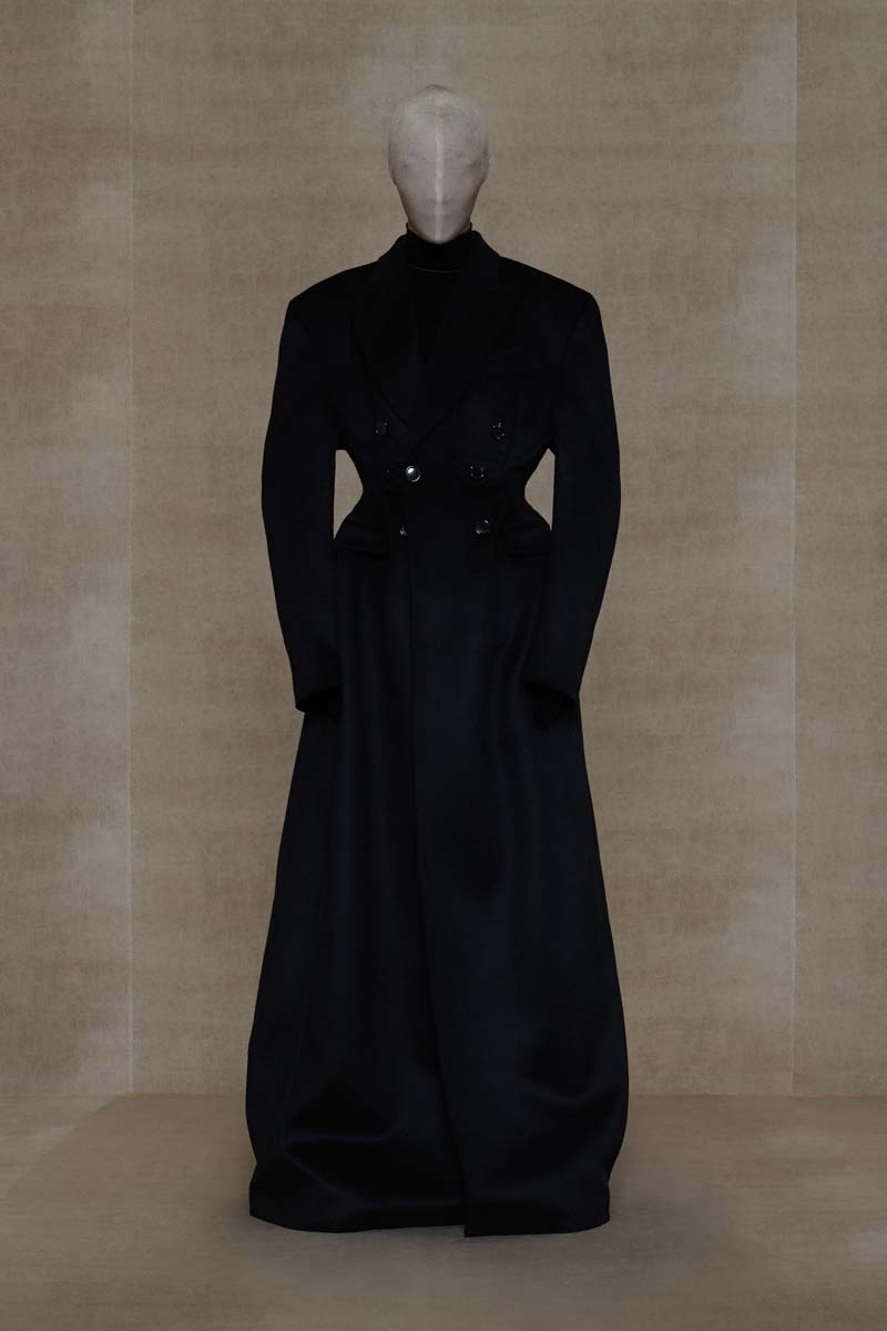 La magia de Vetements, y especialmente SS24, reside en las proporciones y siluetas de sus prendas. La colección abre con conjuntos de alta costura extremadamente ceñidos; un vestido de cola y un body masculino en color champán… Ambos conjuntos están adornados con branding de Vetements Haute Couture, adelantando todo lo que se viene. Siluetas prestadas (o inspiradas en) la colección de Demna se dejan ver en un vestido negro de hombreras redondeadas y una camisa de botones construida para que parezca que está siendo azotada por el viento… que nadie ponga en duda que estos dos son hermanos.