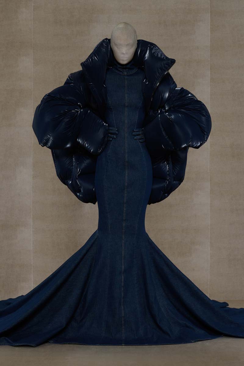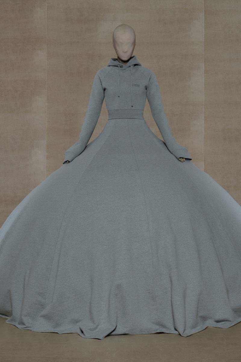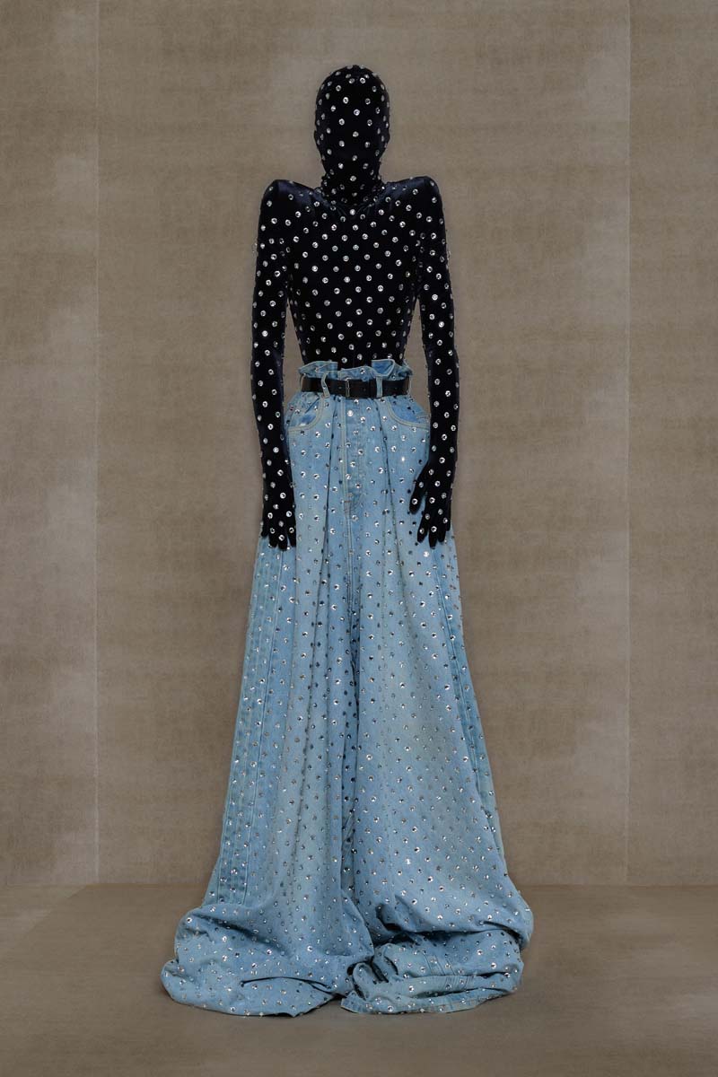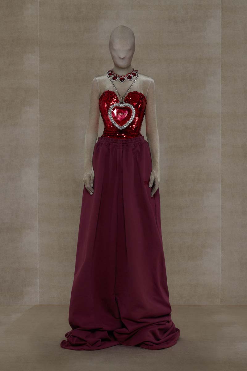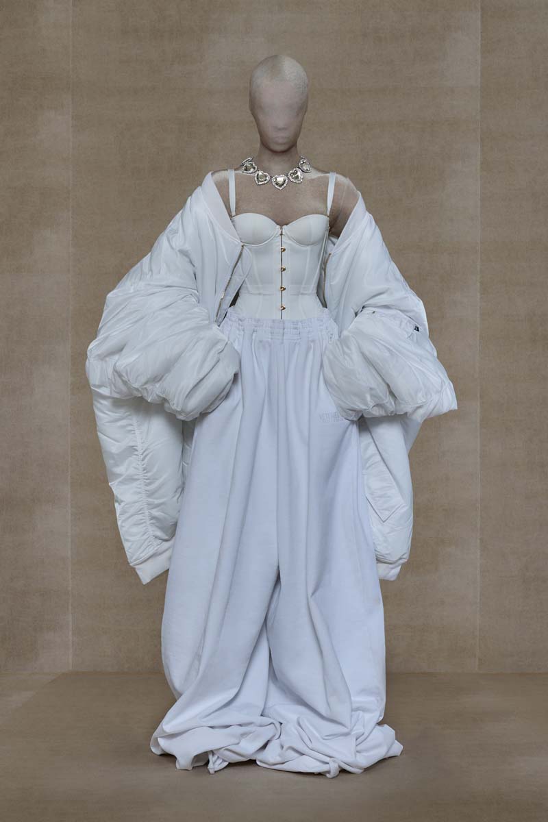 Como punto muy interesante de contraste, Vetements SS24 introdujo códigos de la alta costura más elevada de la única manera que saben hacerlo… con aire urbano. Corsés de encaje muy delicado se combinaban con pantalones de chándal, los monos ceñidos de cuerpo entero se cubrían con abrigos acolchados y conjuntos de vestidos de cola de sirena y puffers hacían de puente entre ambos componentes de la colección. En el otro extremo, esta colección si que presentó siluetas de alta costura como vestidos de proporciones teatrales con crinolinas exageradas, vestidos de cola de sirena en cuero, reinterpretaciones arquitectónicas y acolchadas del abrigo urbano e híbridos de mono y vestido acabados en lentejuelas… con muchísimo brillo.