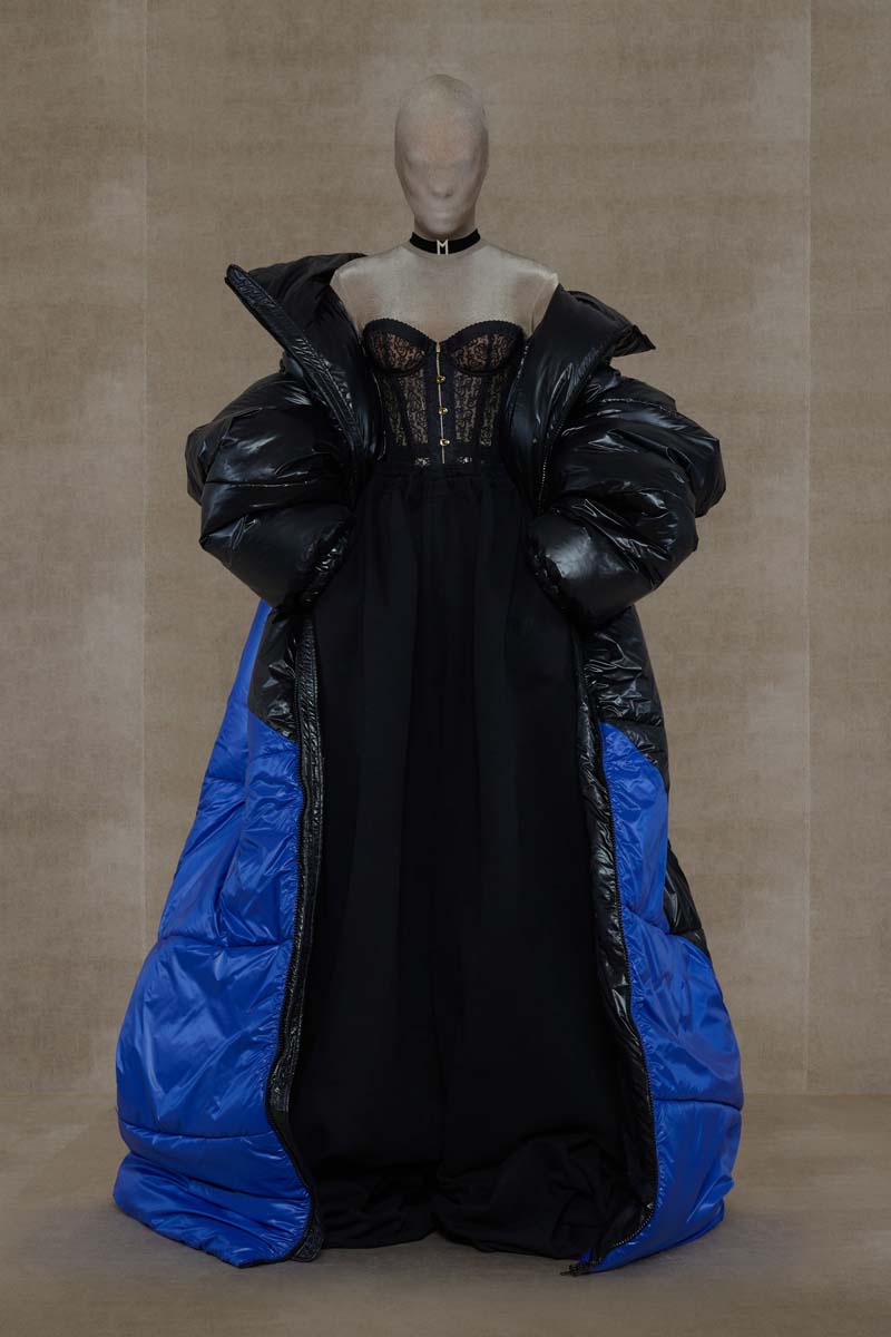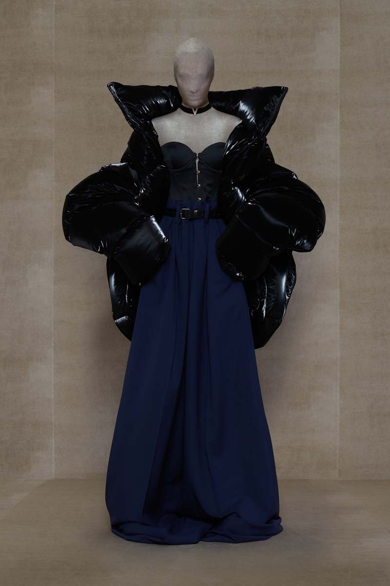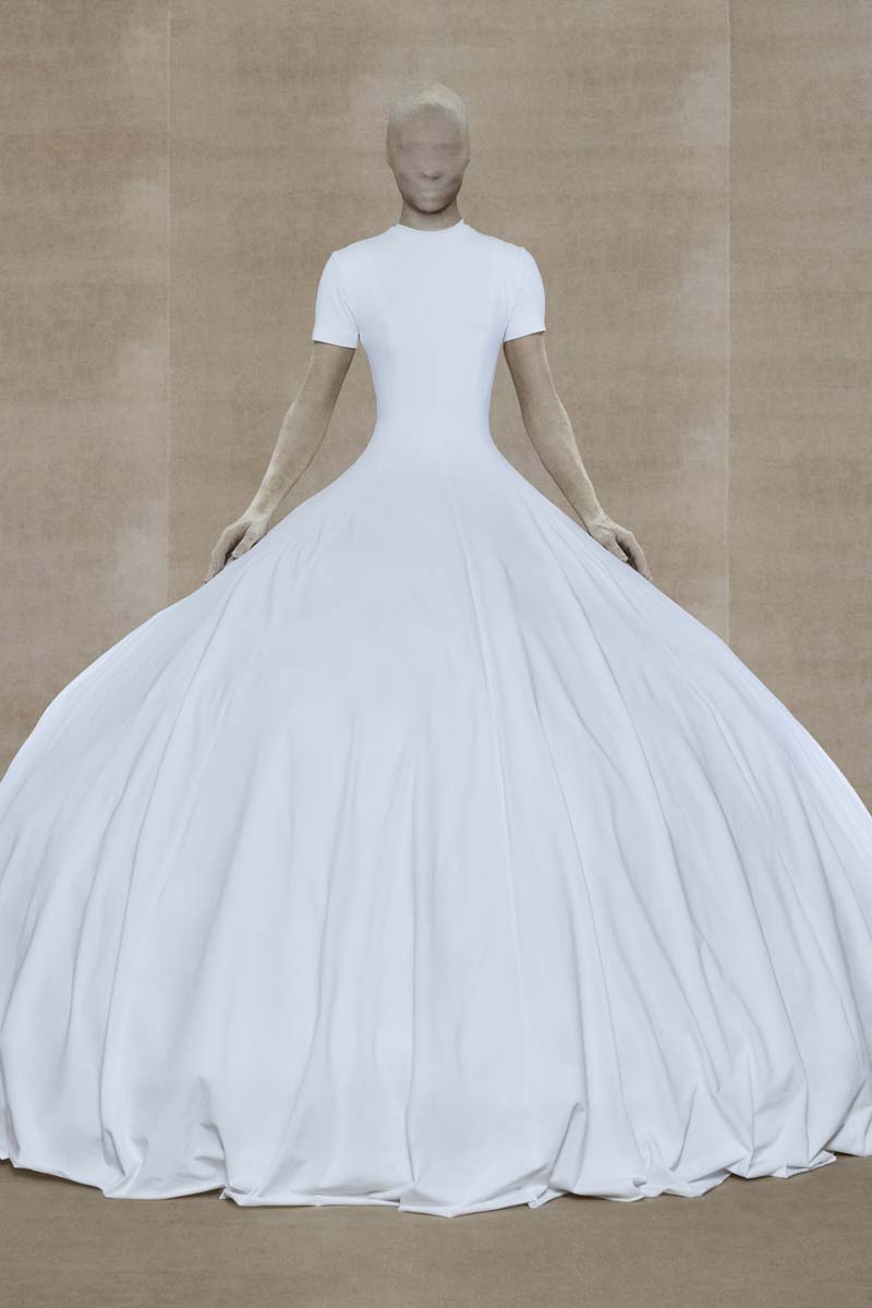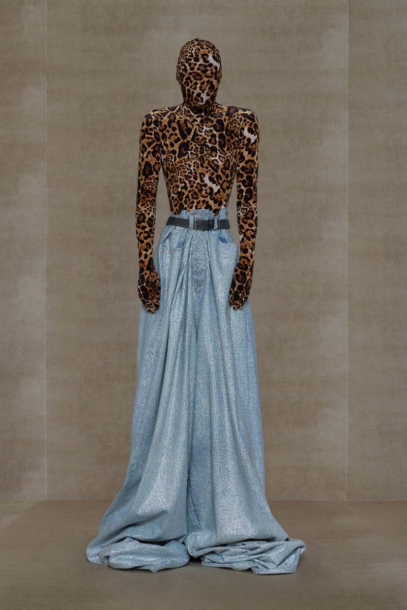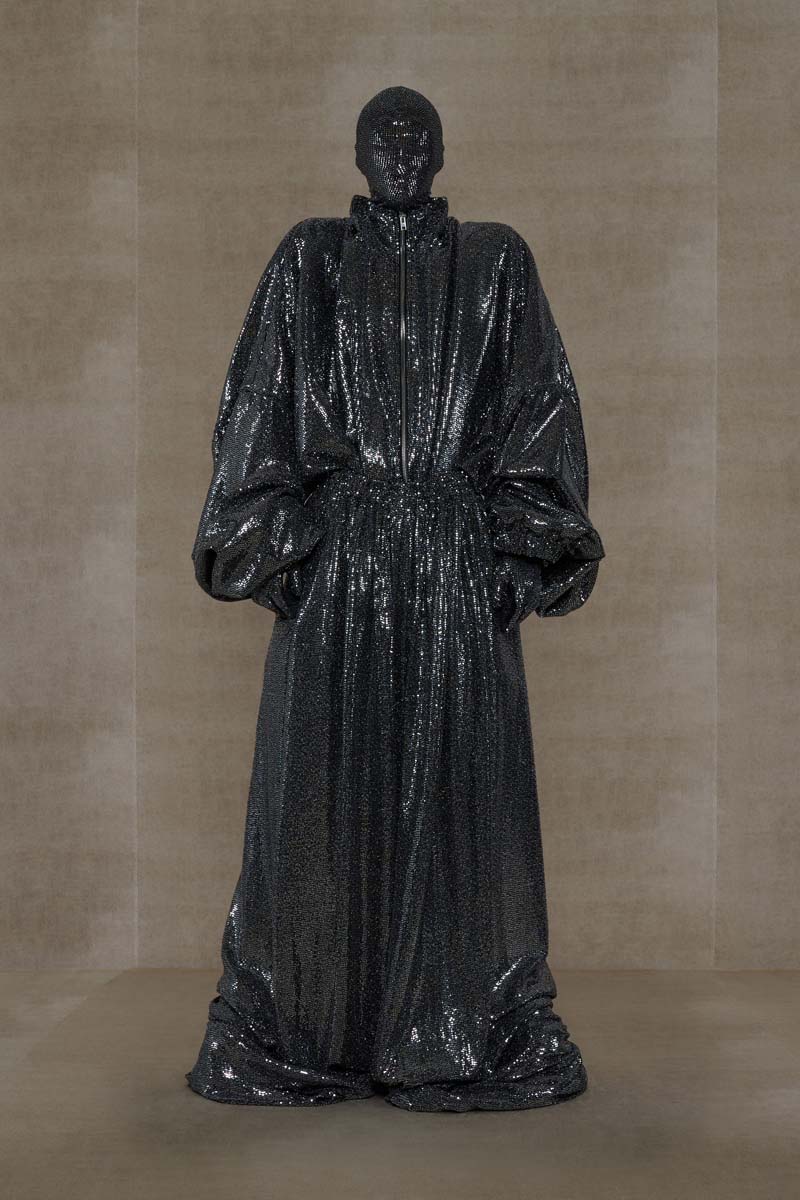 Como punto muy interesante de contraste, Vetements SS24 introdujo códigos de la alta costura más elevada de la única manera que saben hacerlo… con aire urbano. Corsés de encaje muy delicado se combinaban con pantalones de chándal, los monos ceñidos de cuerpo entero se cubrían con abrigos acolchados y conjuntos de vestidos de cola de sirena y puffers hacían de puente entre ambos componentes de la colección. En el otro extremo, esta colección si que presentó siluetas de alta costura como vestidos de proporciones teatrales con crinolinas exageradas, vestidos de cola de sirena en cuero, reinterpretaciones arquitectónicas y acolchadas del abrigo urbano e híbridos de mono y vestido acabados en lentejuelas… con muchísimo brillo.