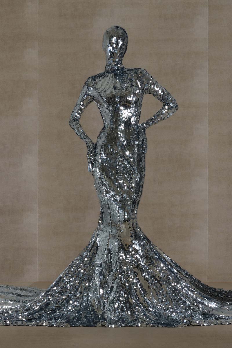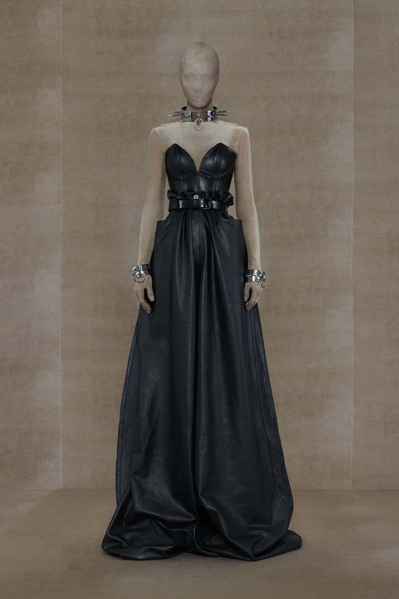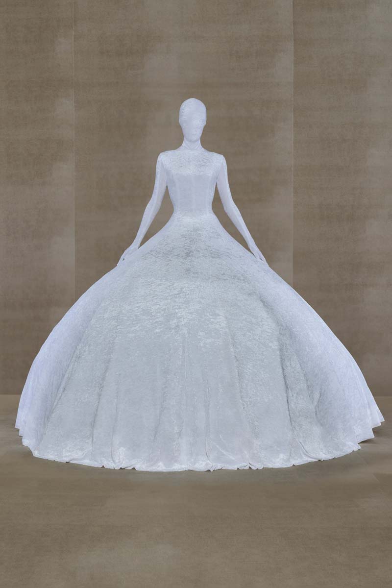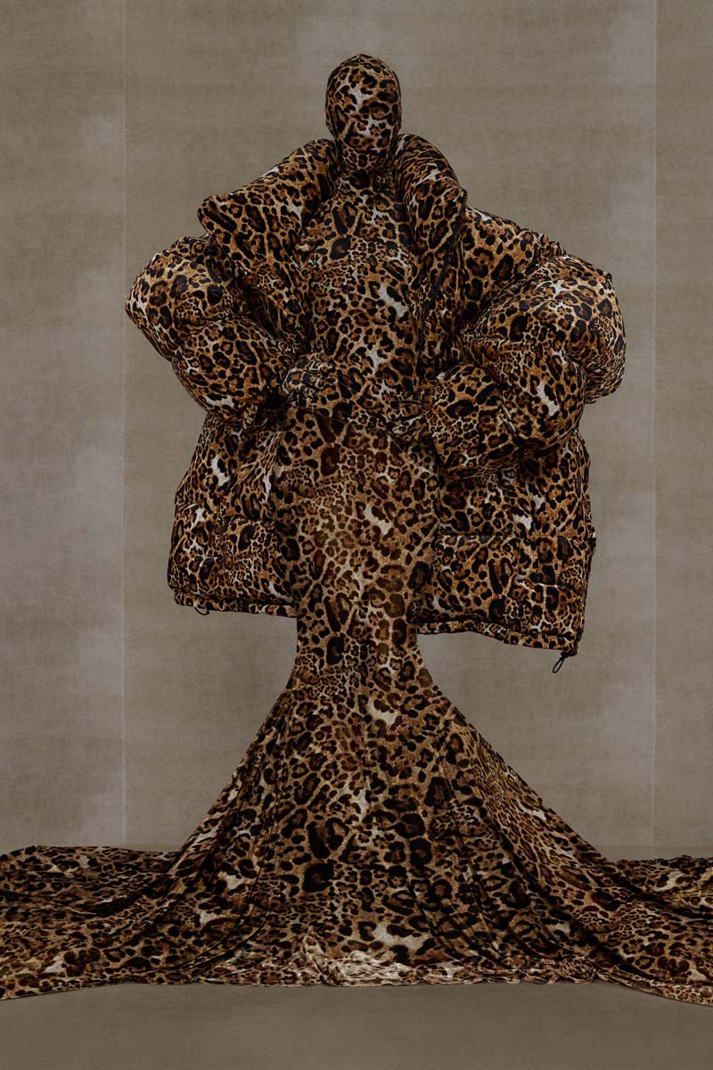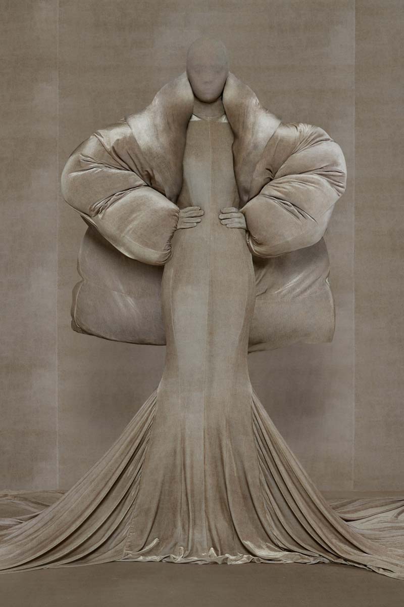 Como punto muy interesante de contraste, Vetements SS24 introdujo códigos de la alta costura más elevada de la única manera que saben hacerlo… con aire urbano. Corsés de encaje muy delicado se combinaban con pantalones de chándal, los monos ceñidos de cuerpo entero se cubrían con abrigos acolchados y conjuntos de vestidos de cola de sirena y puffers hacían de puente entre ambos componentes de la colección. En el otro extremo, esta colección si que presentó siluetas de alta costura como vestidos de proporciones teatrales con crinolinas exageradas, vestidos de cola de sirena en cuero, reinterpretaciones arquitectónicas y acolchadas del abrigo urbano e híbridos de mono y vestido acabados en lentejuelas… con muchísimo brillo.