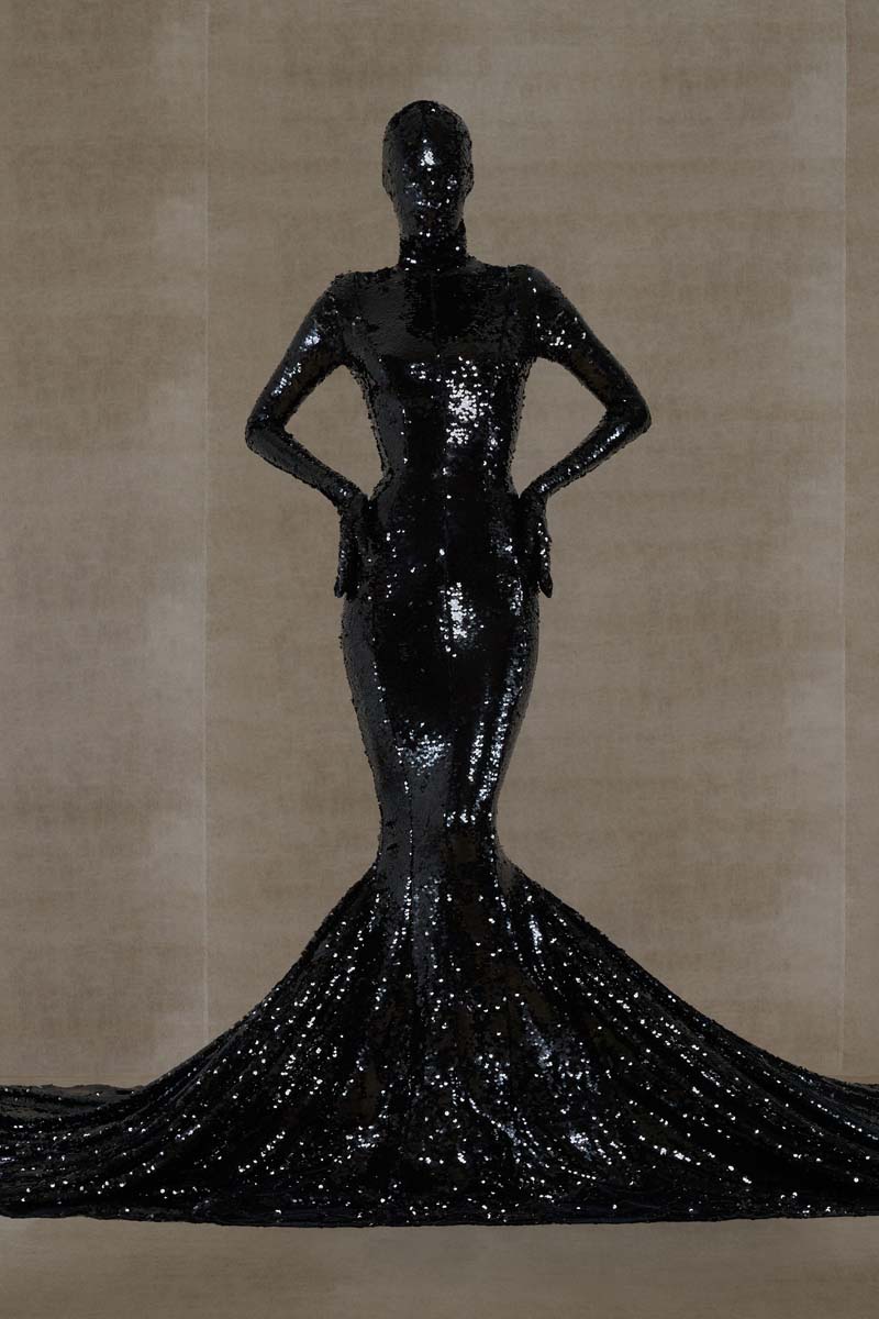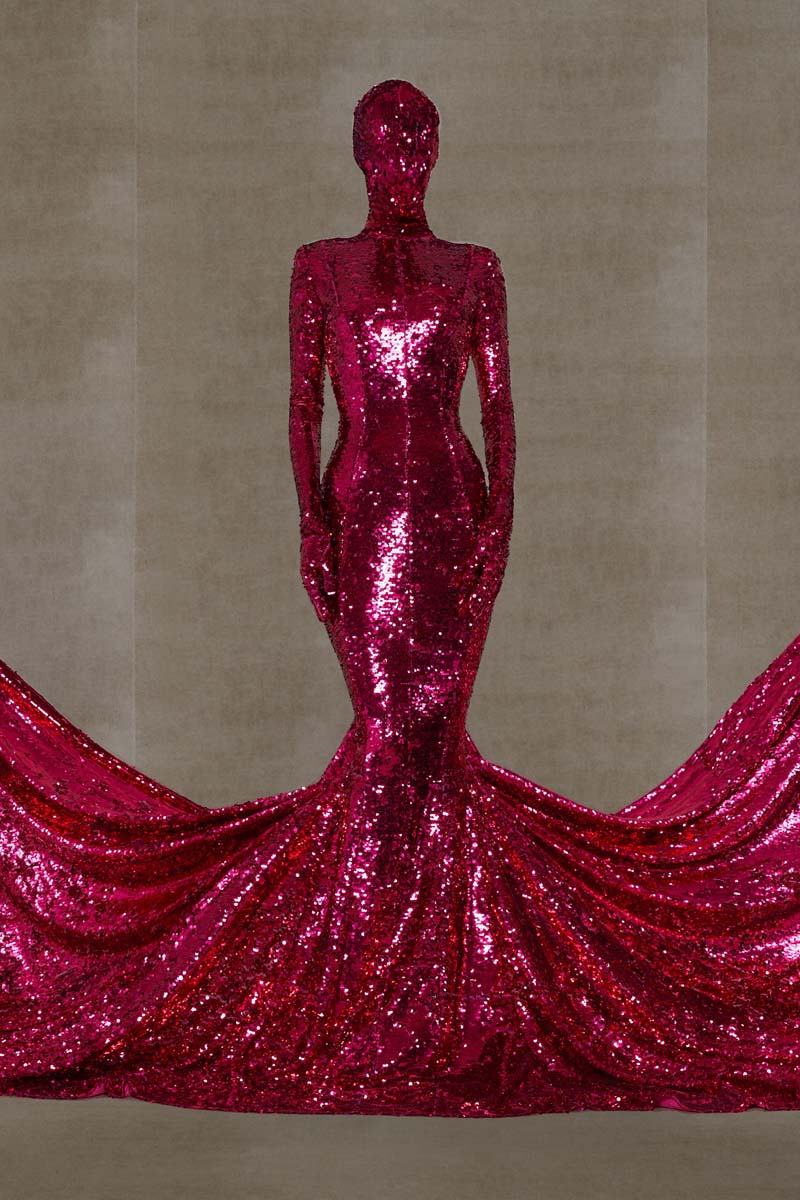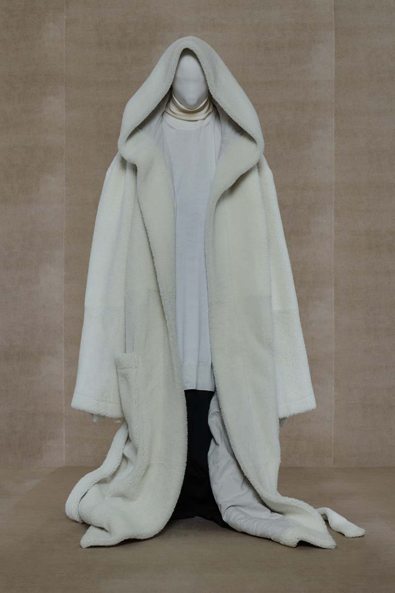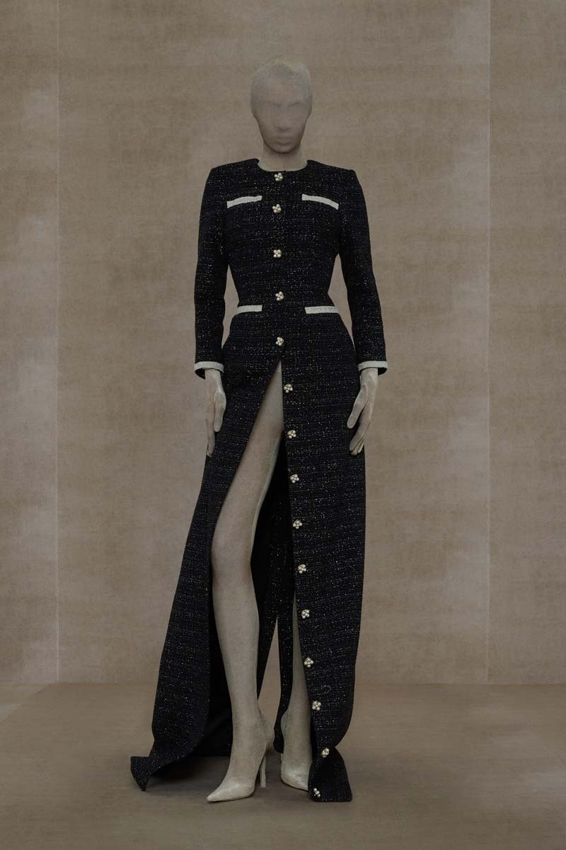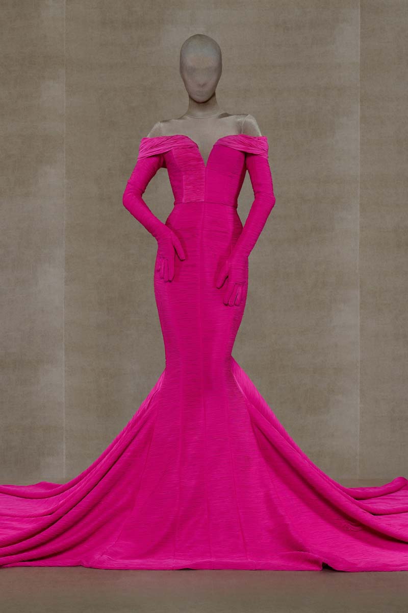 Como punto muy interesante de contraste, Vetements SS24 introdujo códigos de la alta costura más elevada de la única manera que saben hacerlo… con aire urbano. Corsés de encaje muy delicado se combinaban con pantalones de chándal, los monos ceñidos de cuerpo entero se cubrían con abrigos acolchados y conjuntos de vestidos de cola de sirena y puffers hacían de puente entre ambos componentes de la colección. En el otro extremo, esta colección si que presentó siluetas de alta costura como vestidos de proporciones teatrales con crinolinas exageradas, vestidos de cola de sirena en cuero, reinterpretaciones arquitectónicas y acolchadas del abrigo urbano e híbridos de mono y vestido acabados en lentejuelas… con muchísimo brillo.