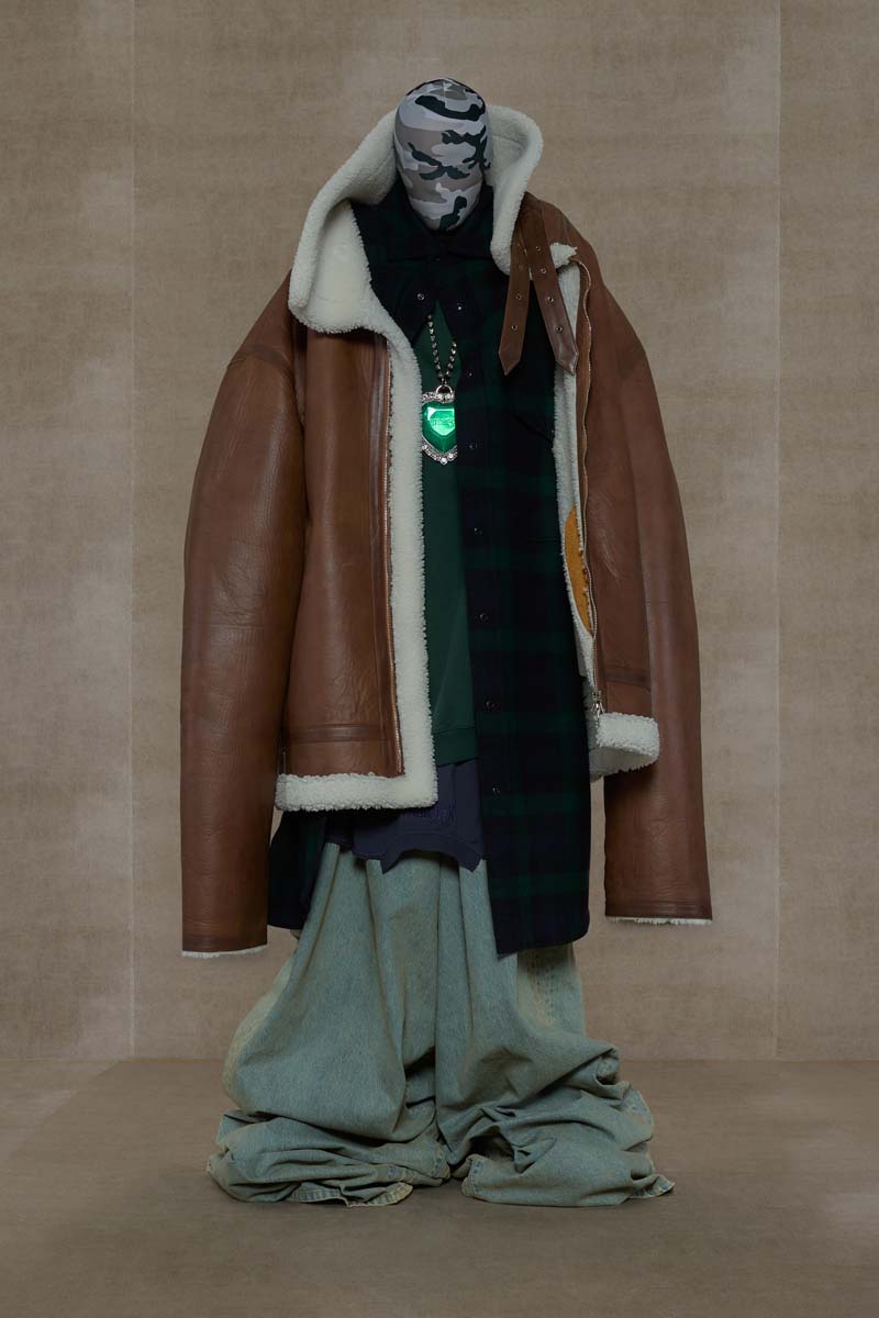 Lo que siguió en Vetements SS24 son siluetas clásicas de moda urbana oversized; pero llevadas al extremo. De tallaje 16XL, como anuncian los gráficos estilo varsity de sus sudaderas, podemos encontrar cazadoras moteras, bombers, abrigos puffer, camisas de cuadros, pantalones cargo, chaquetas de aviador, conjuntos en camuflaje y de workwear reflectante…. todos pilares fundamentales del estilo urbano high street de Vetements; llevado al extremo, claro. A este componente más street se le suman prendas del armario más clásico como conjuntos de sastrería, abrigos de sastre y trench y gabardinas en piel; incluso se vieron reinterpretaciones de la clásica chaqueta de Chanel. El toque más trendy lo aportaron los conjuntos biker de estilo motorcore y los embellecimientos metálicos de algunas prendas vaqueras.