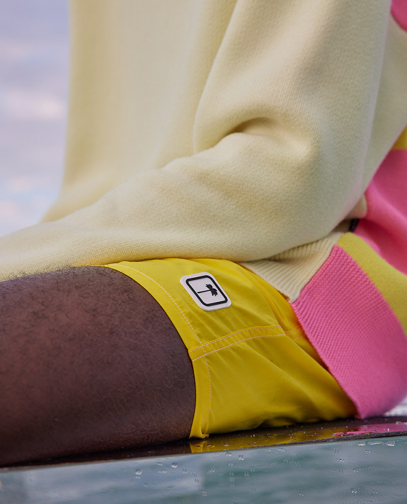 Los bañadores de esta colección traen una etiqueta especial de Palm Angels en la parte trasera (justo debajo del mítico parche de Vilebrequin) y los modelos en colores sólidos van a tener también un parche de goma con el logo de la palmera de Palm Angels en el costado de la pierna… para que nadie piense que se trata de un simple bañador cualquiera.