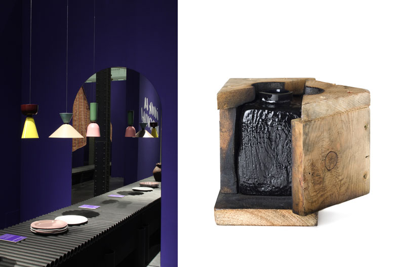 Imagen superior izquierda: Vista de la exposición con la lámpara Alphabeta, de Luca Nichetto para HEM. Derecha: François Azambourg. Jarrón Douglas