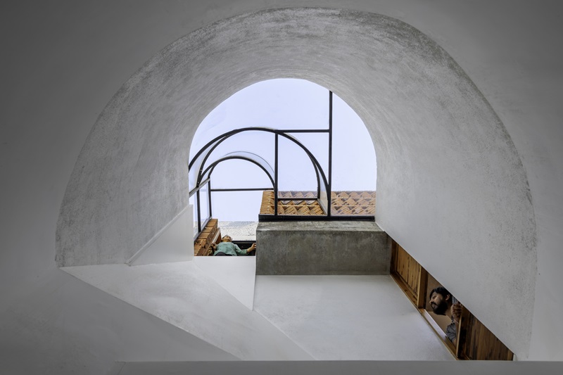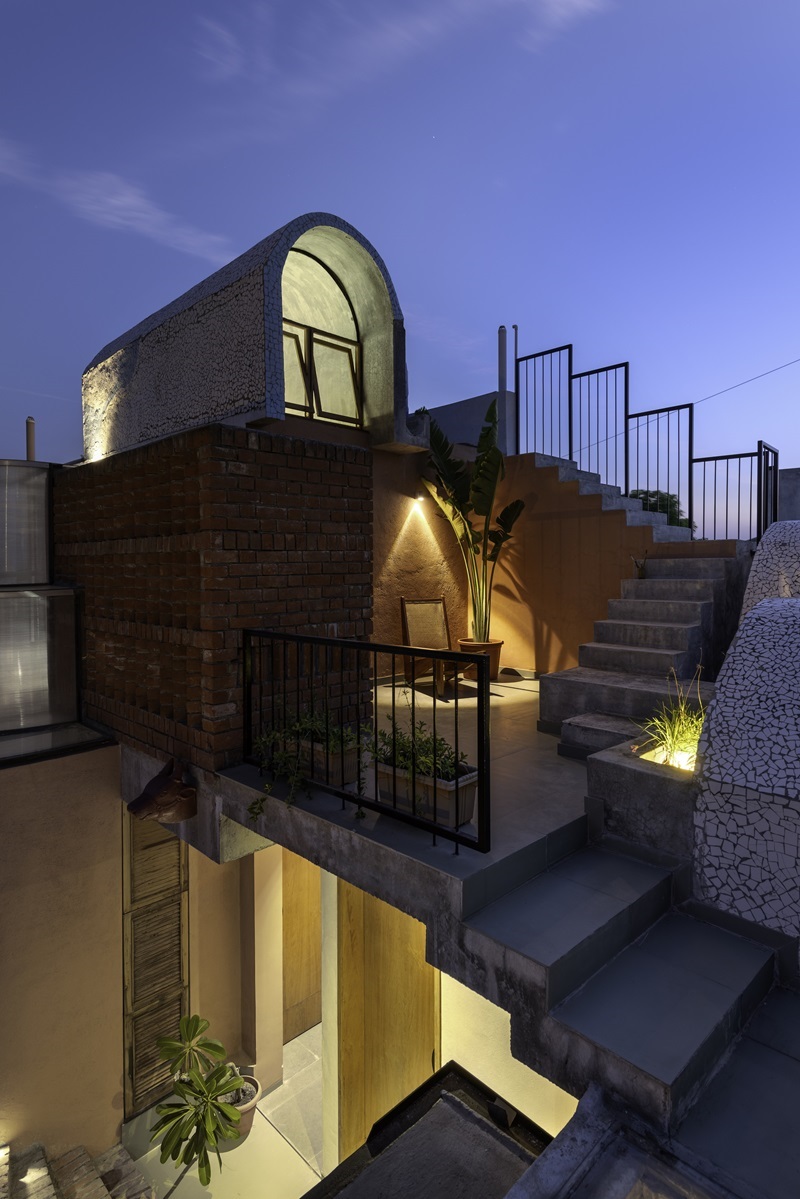 El equipo de Vrushaket Pawar + Architects (VP+A) construye una casa para un artista en la India, que sorprende por sus bóvedas, variedad de texturas y terrazas escalonadas.