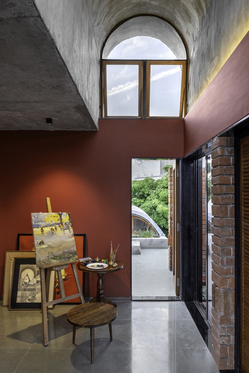 Una terraza al final de la escalera permite el acceso al estudio del artista, que cuenta con un pequeño estanque de peces junto a la puerta de entrada. El interior del espacio abovedado destaca por sus paredes de color rojo, que comunican con otra terraza exterior más íntima y también con la gran linterna. Incluso hay una barandilla que permite asomarse a la cavidad cilíndrica, creando una conexión visual con el comedor. El resultado final es una vivienda asentada sobre sus orígenes, que impacta por la gran riqueza de materiales y el sugerente juego de volúmenes de su arquitectura.