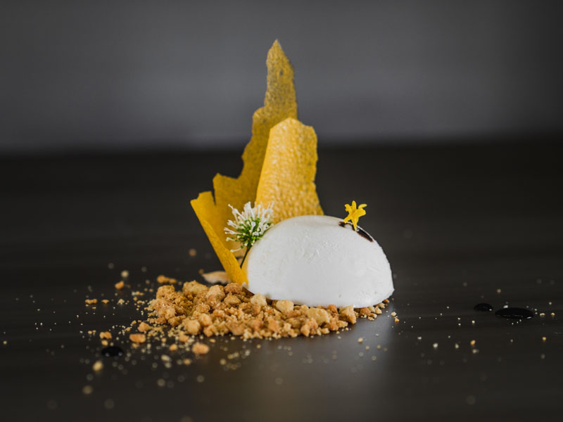 Imagen superior: Sight, helado de Sesamo negro y Yuzu. Polvo de merengue, cristal cítrico y milk crisp.