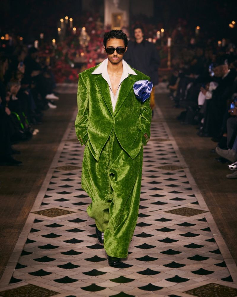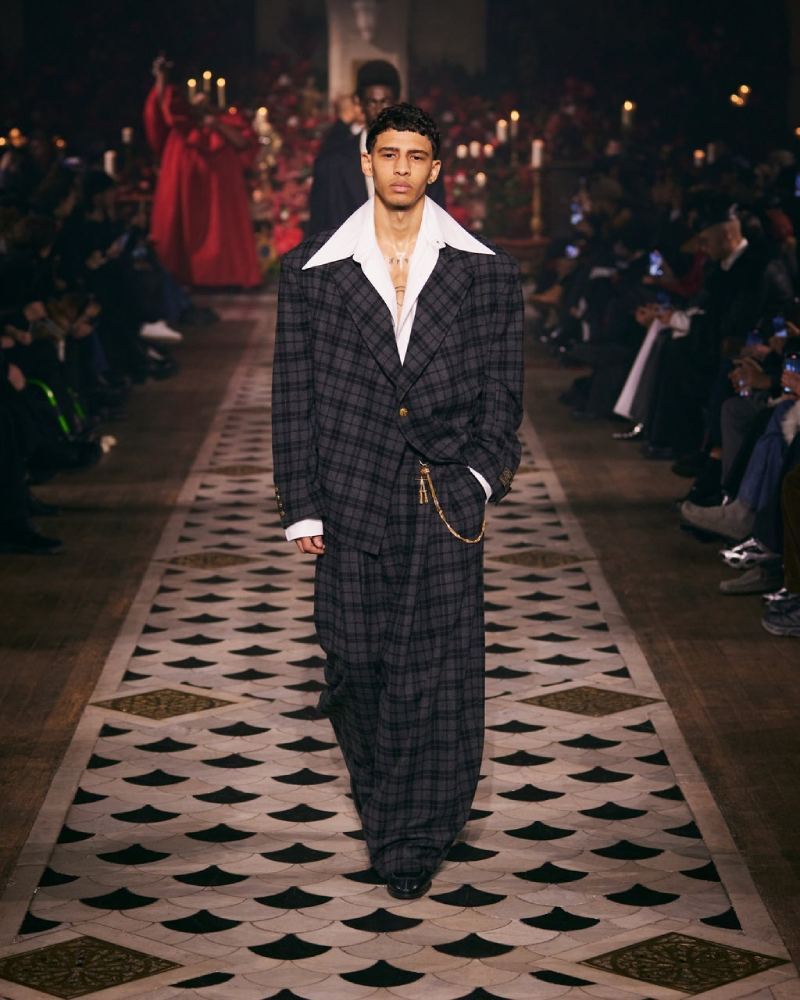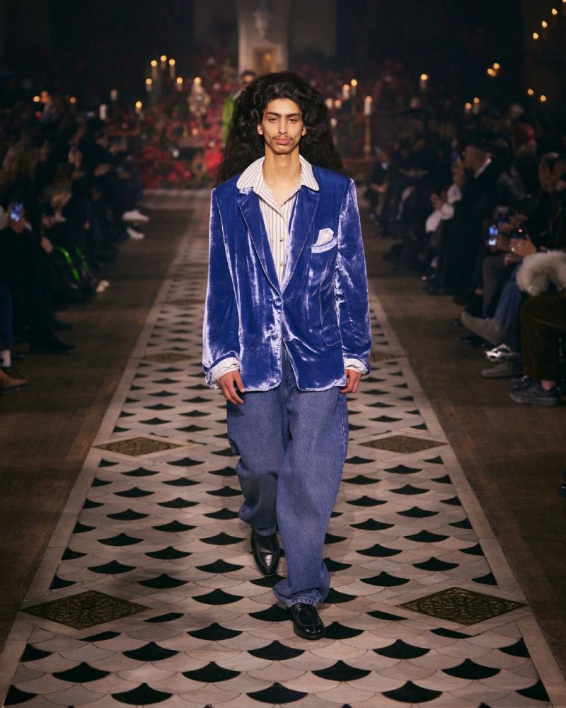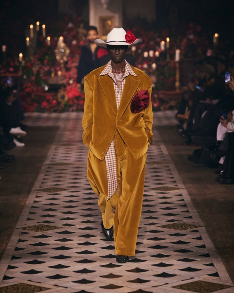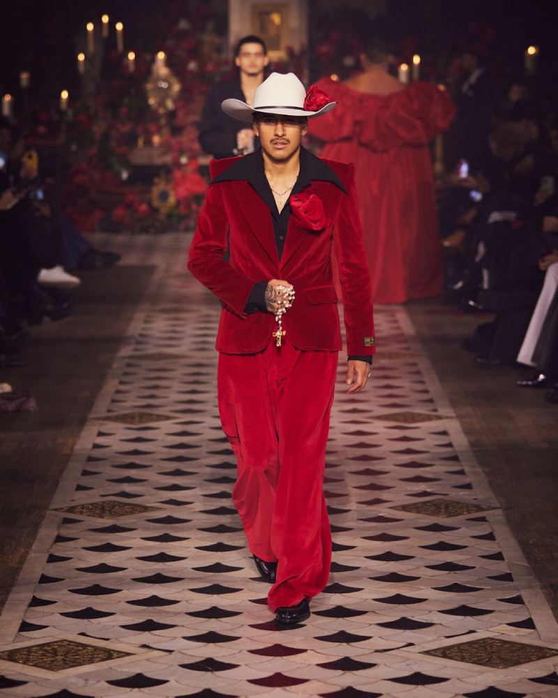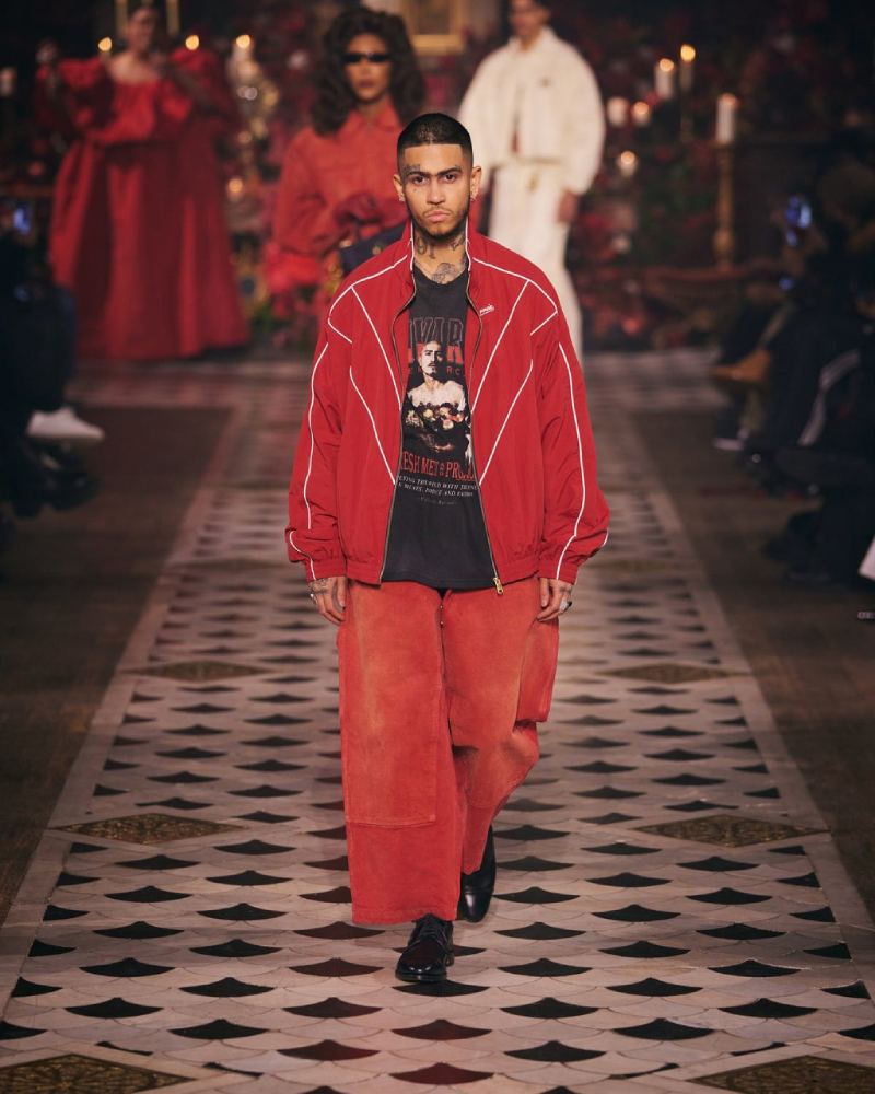 Este punto workwear de Willy Chavarria evoluciona a un terreno más realista, con parkas y conjuntos vaqueros desgastados, camisetas gráficas, camisas de botones a cuadros y sombreros, delicadamente acentuados con rosas rojas. Como parte de su repertorio de Finesse europeo, vemos cómo la icónica chaqueta estilo Chanel se reinterpreta como un staple unisex; igual de chic y refinado que la original, solo que ahora es mucho más oversize. Luego, la sastrería vuelve en su forma más teatral, con trajes que recuerdan a los zoot suits en construcciones de terciopelo de tonos joya muy barrocos.