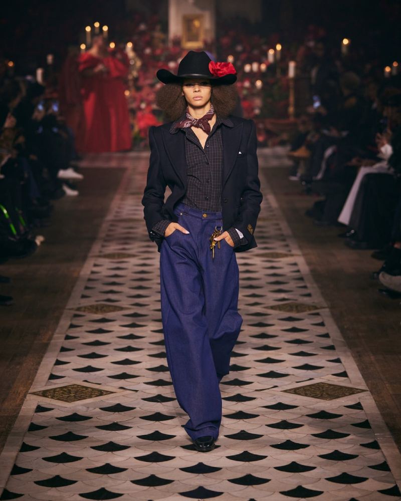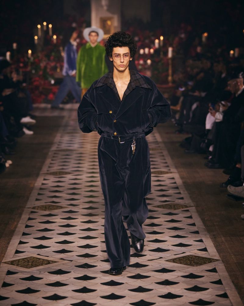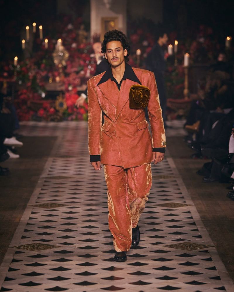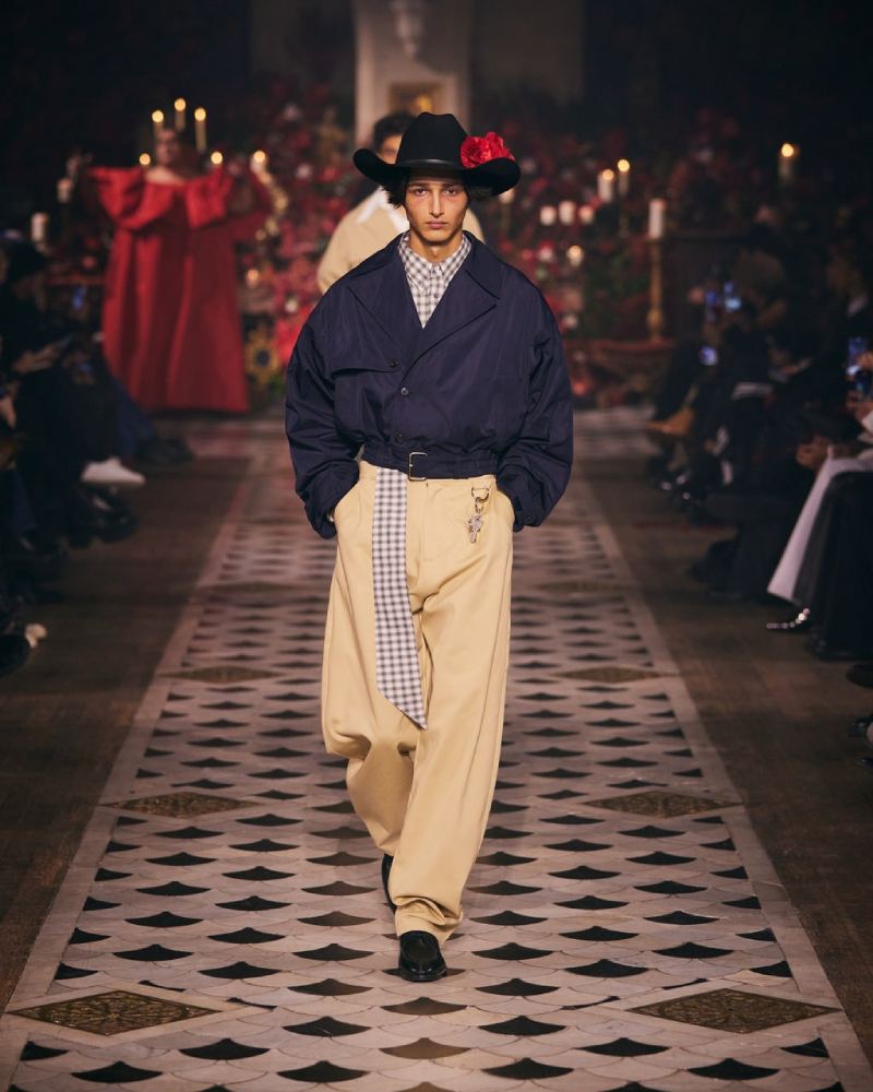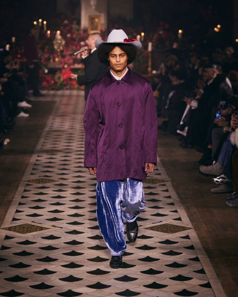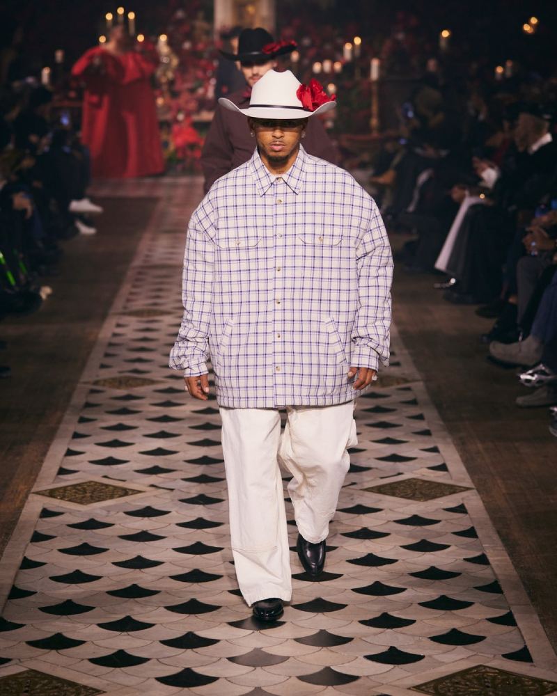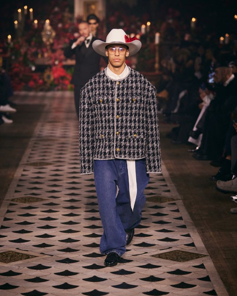 Este punto workwear de Willy Chavarria evoluciona a un terreno más realista, con parkas y conjuntos vaqueros desgastados, camisetas gráficas, camisas de botones a cuadros y sombreros, delicadamente acentuados con rosas rojas. Como parte de su repertorio de Finesse europeo, vemos cómo la icónica chaqueta estilo Chanel se reinterpreta como un staple unisex; igual de chic y refinado que la original, solo que ahora es mucho más oversize. Luego, la sastrería vuelve en su forma más teatral, con trajes que recuerdan a los zoot suits en construcciones de terciopelo de tonos joya muy barrocos.