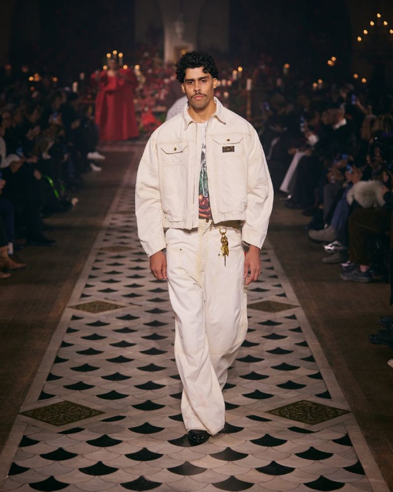 A grandes trazos, la colección FW25 de Willy Chavarria se enfoca en plasmar todos los contrastes que componen su trasfondo personal. Fuerza, delicadeza, romanticismo, moda urbana, sastrería… Todo bajo un velo del contraste de la luz y la sombra.
