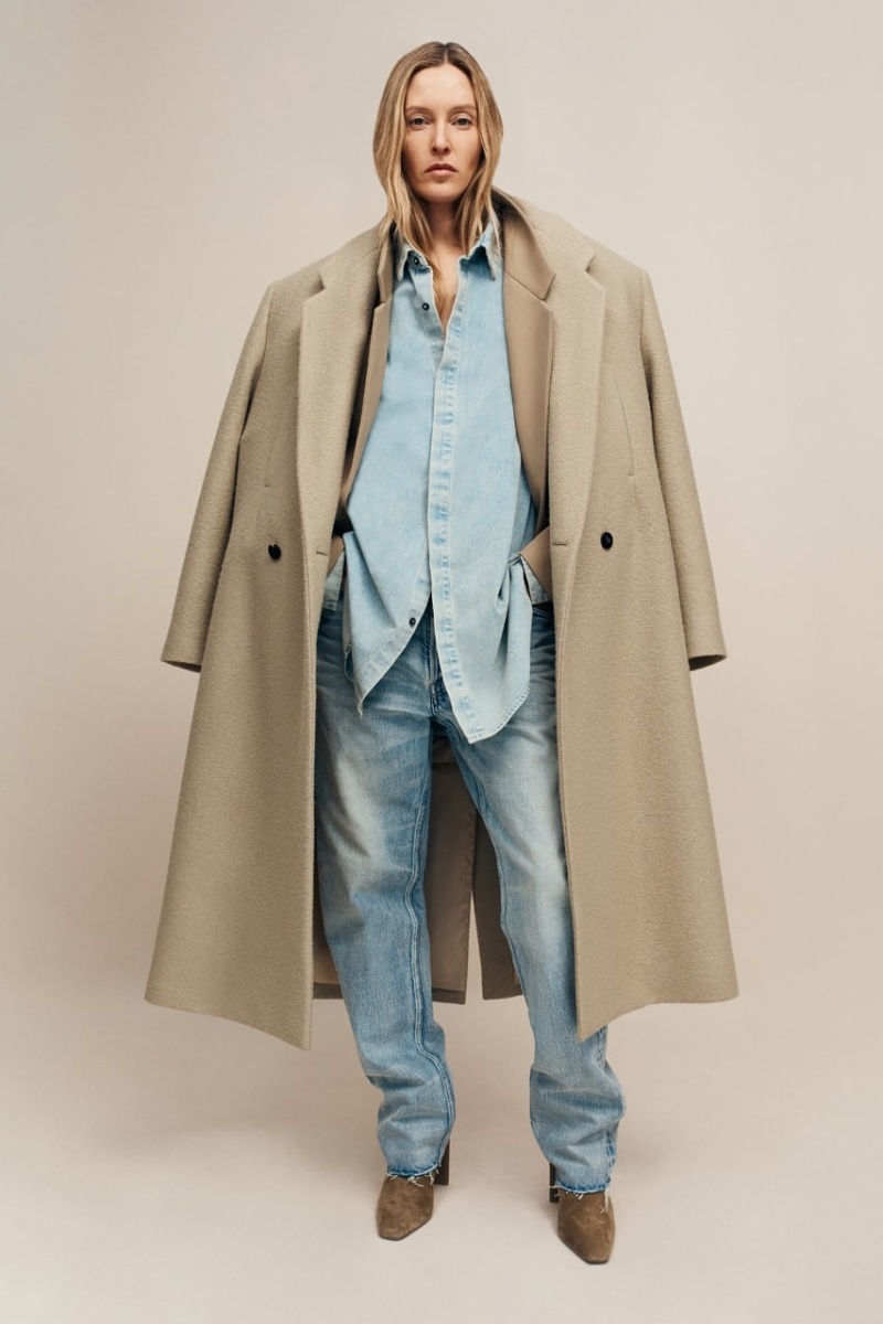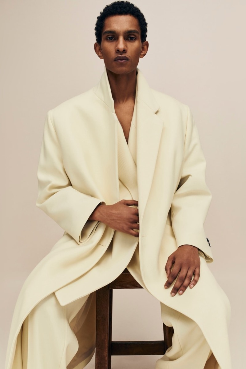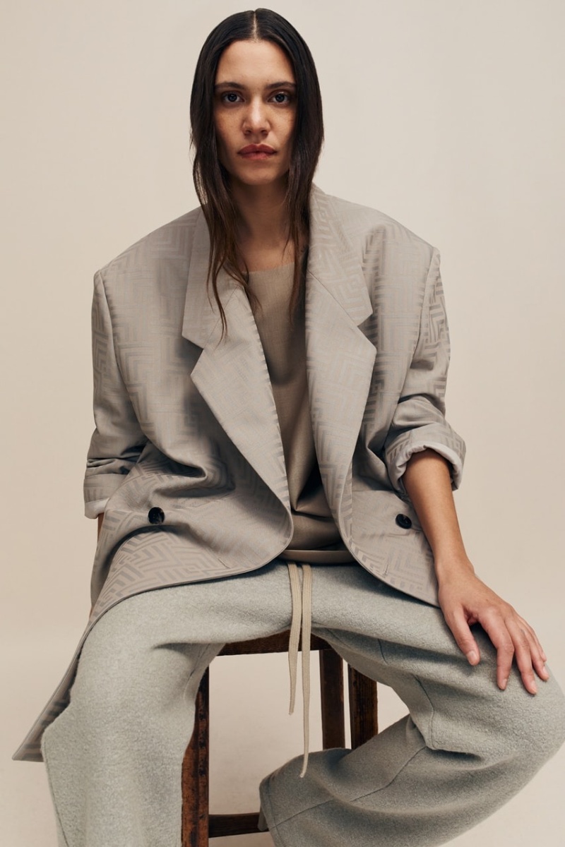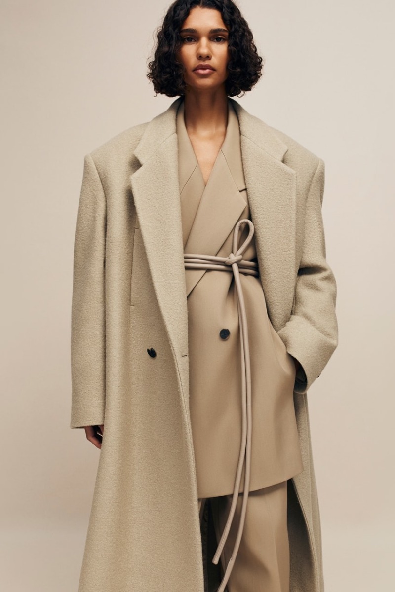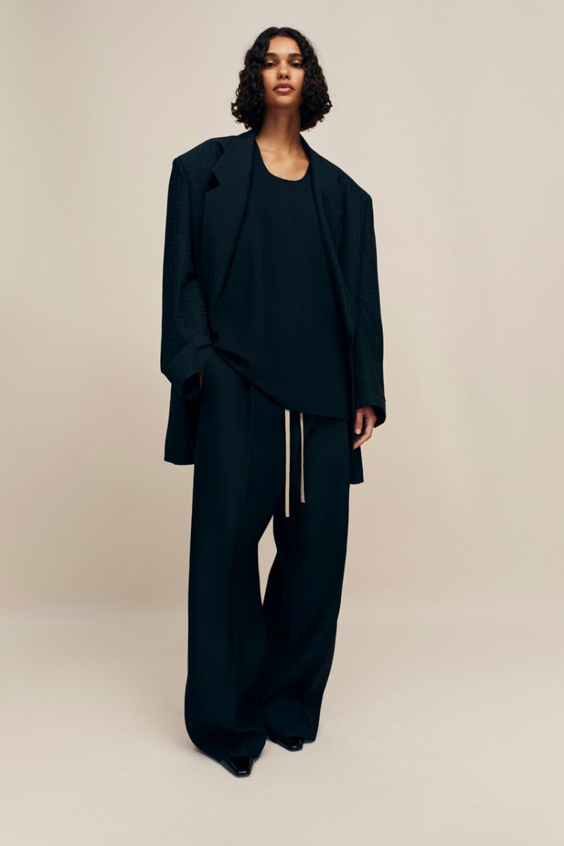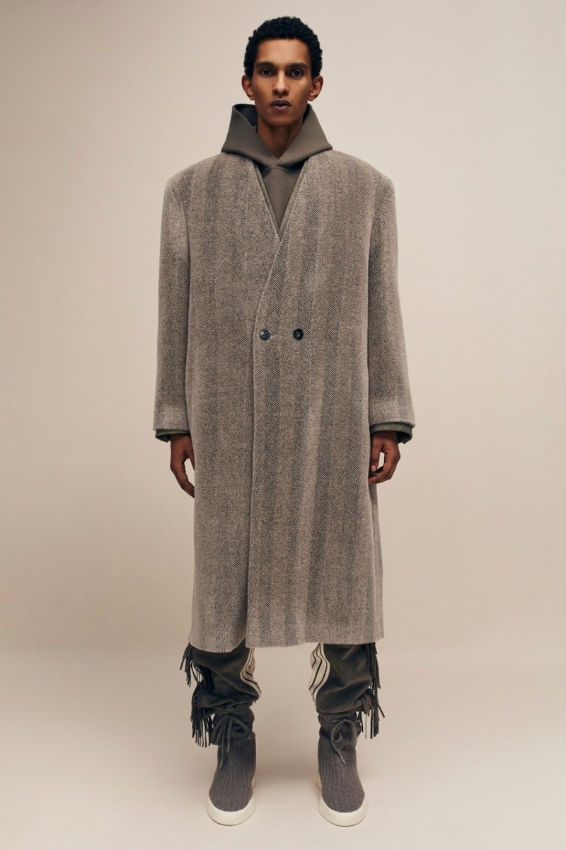 Siguiendo la línea principal de recientes entregas, Fear of God Collection 8 pone su enfoque en las siluetas más clásicas (que se vuelven aún más relevantes ahora que tenemos la tendencia del nuevo menswear). Aquí, los principales protagonistas son los abrigos largos. Presentados en el lenguaje clásico de Lorenzo, estas piezas se construyen con una silueta con hombreras anchas y caídas, cuerpos holgados y una especial atención a los detalles. Los estilos más clásicos presentan solapas estilizadas y con mucha verticalidad, pero también vemos deconstrucciones más atrevidas. Las americanas siguen esta misma línea y los pantalones de pinzas se presentan con el distintivo corte baggy de FoG. En el terreno de estos materiales, vemos construcciones de lana lisa y clásica… pero destacan mucho más las espigas, los monogramas y la lana bouclé.