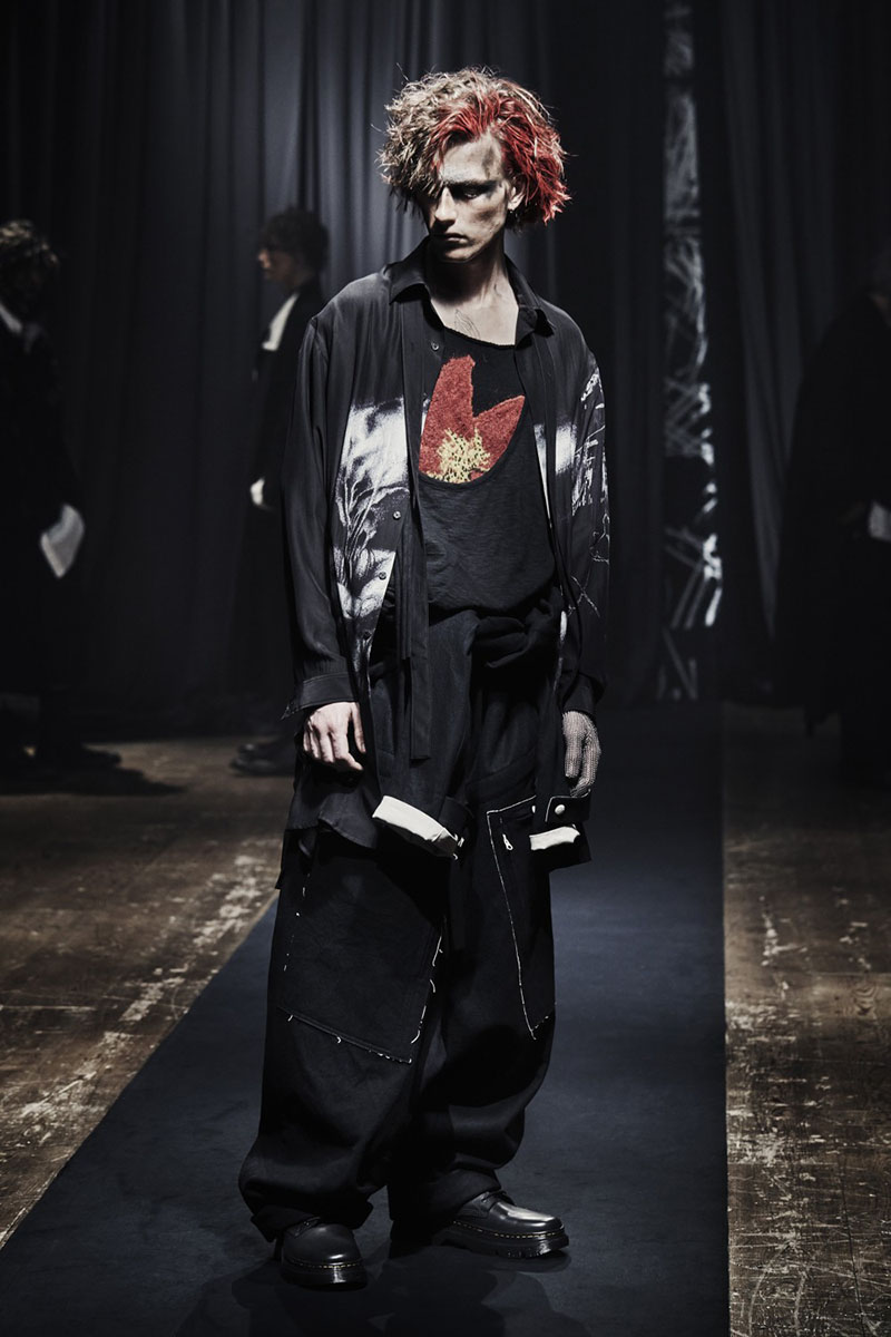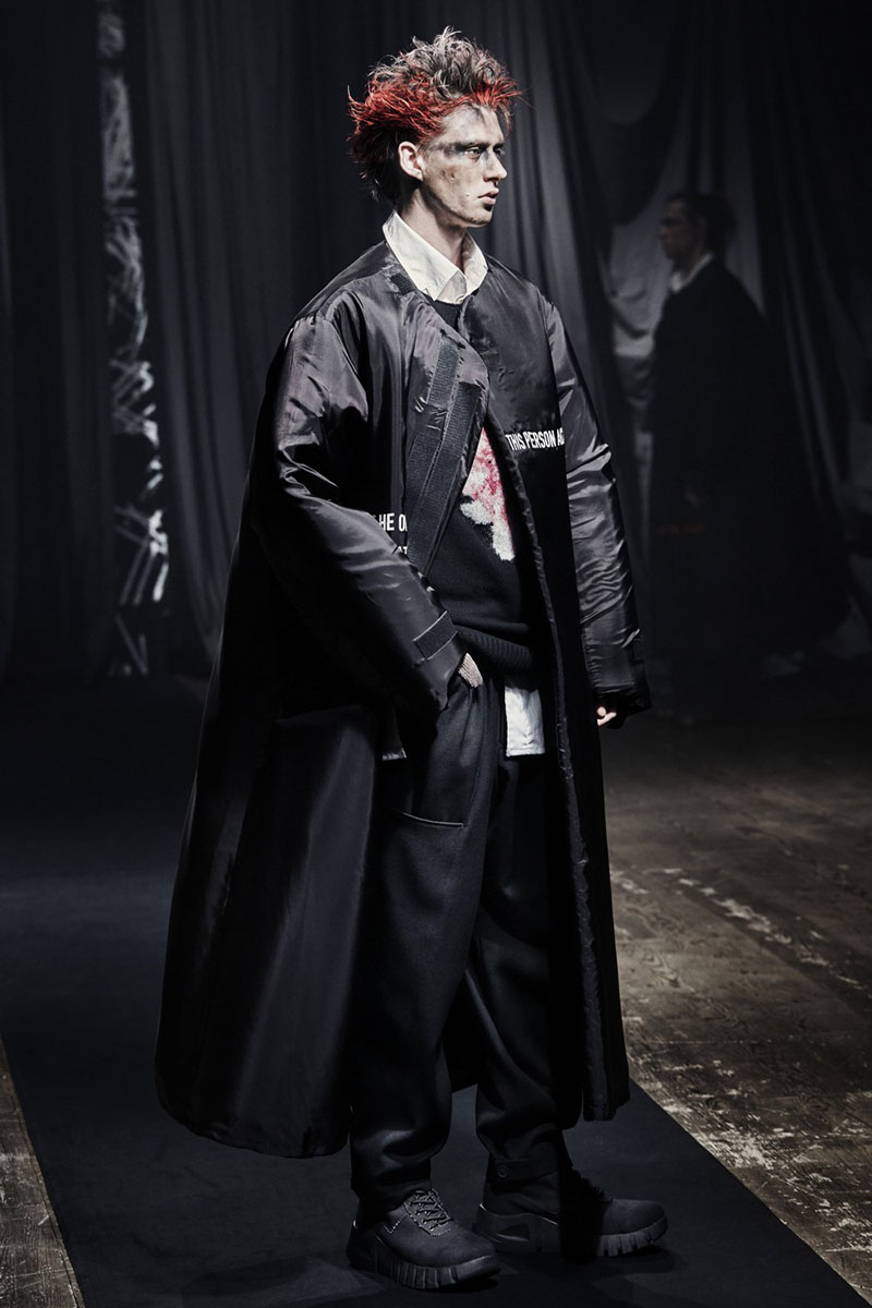 Detalles como las correas, ganchos y colgantes y frases y dibujos estampados en blanco rompen con los total black looks y dan profundidad a la colección. También podemos ver algunos detalles en colores tenues en algunos diseños. El calzado que Yohji ha escogido es la silueta derbi de cuero y zapatillas con suela XXL. Con el contraste de prendas lisas y otras con detalles el diseñador consigue llevar la atención del espectador donde desea.