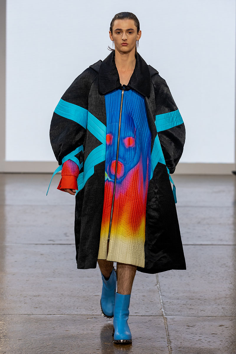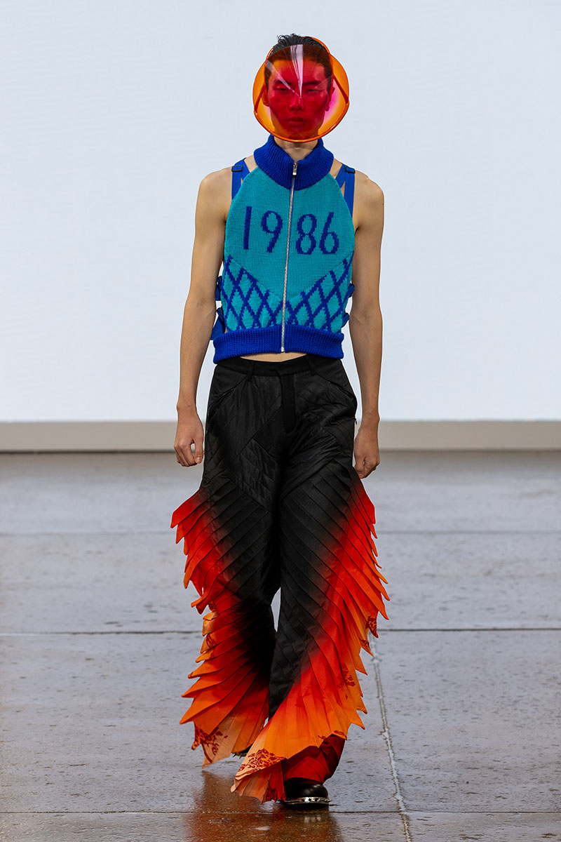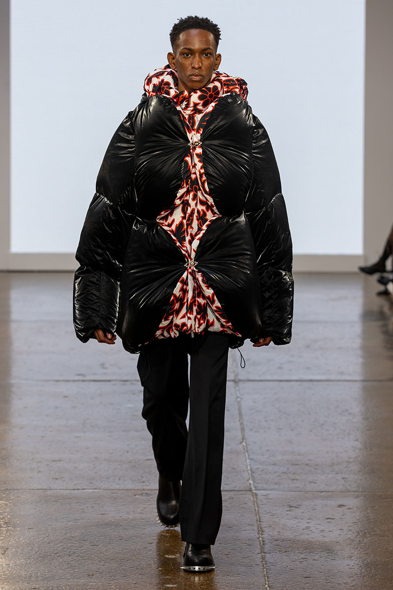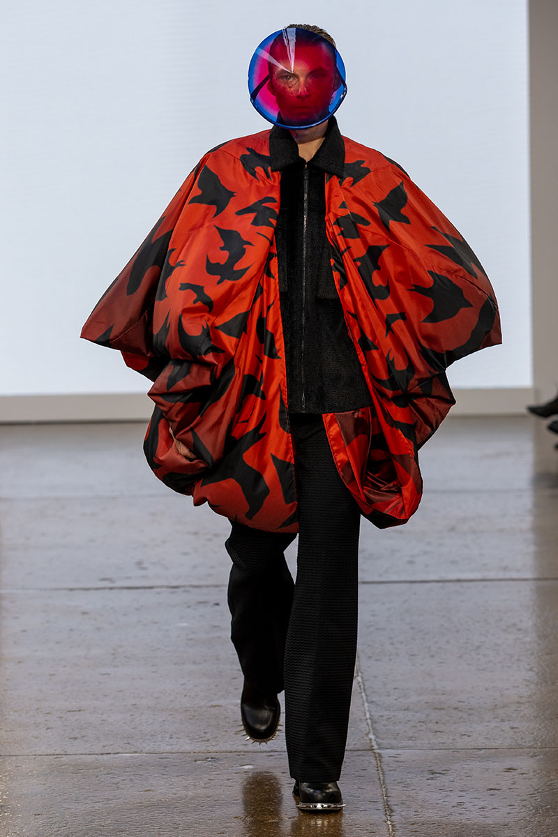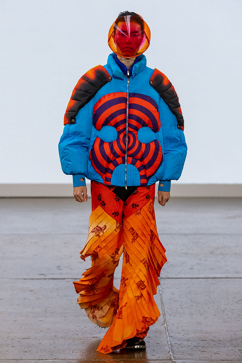 Yonghao Xie describe su estética como “oscura, auténtica y contemporánea”; y sus diseños están centrados en la deconstrucción técnica y los estampados. El resultado son diseños unisex de aspecto potente y sobre todo muy conceptual. En esta colección con la que se ha “presentado en sociedad”, el tema gira en torno al lado oscuro del entorno natural actual y el estatus social.
