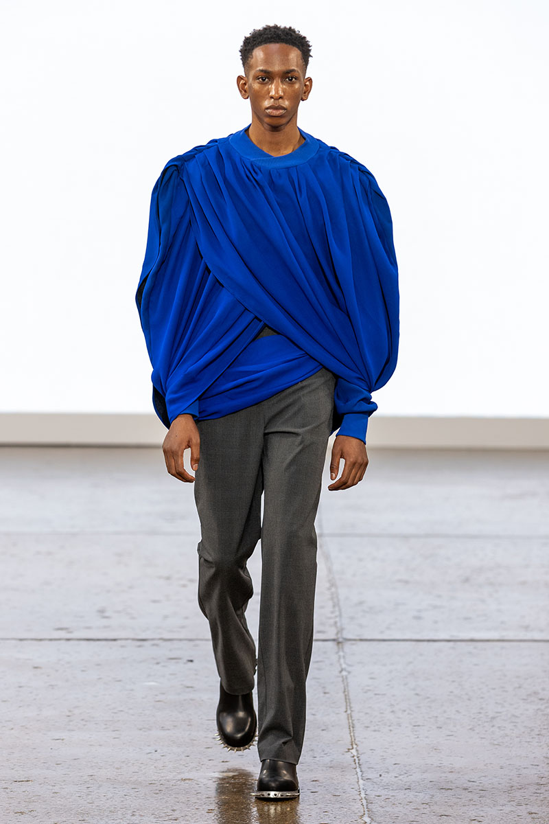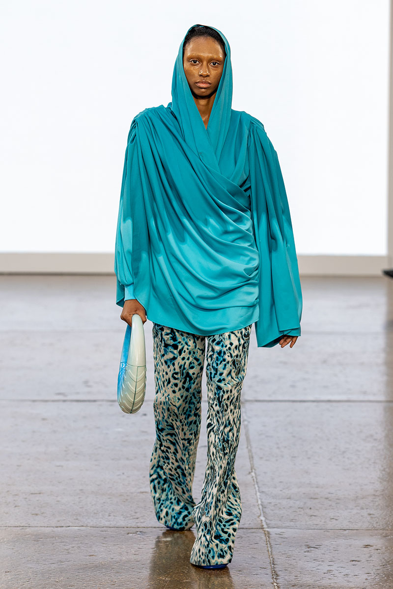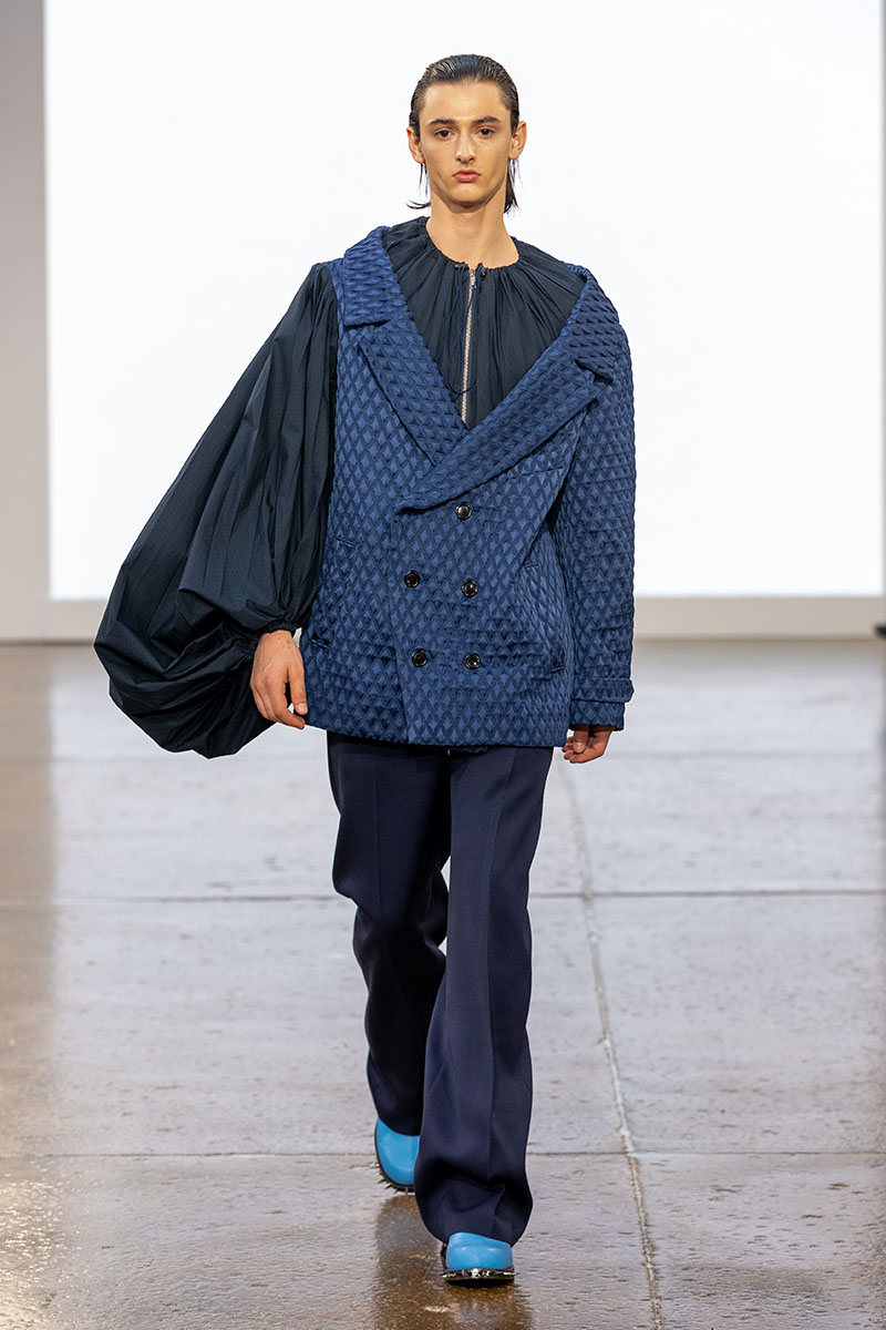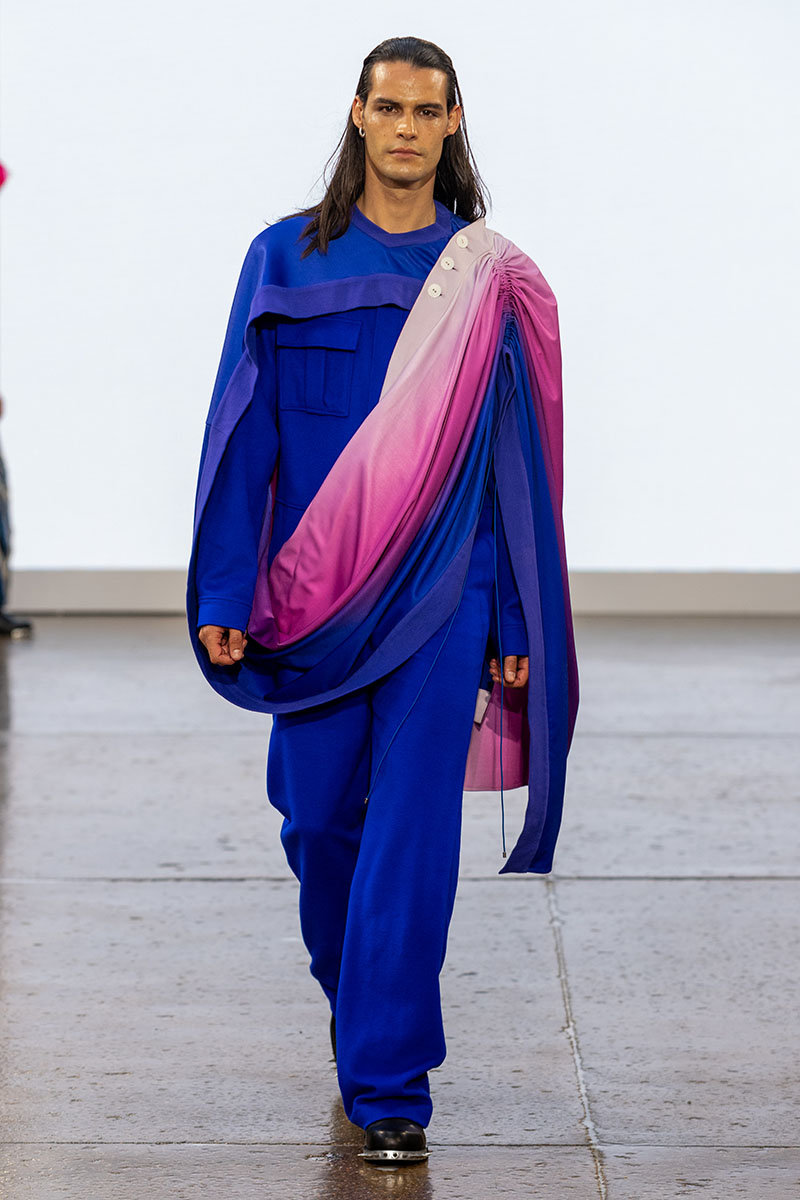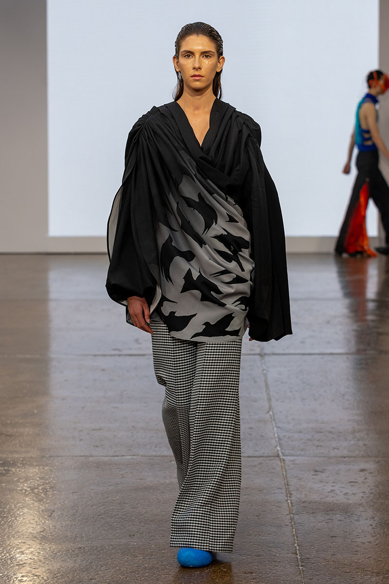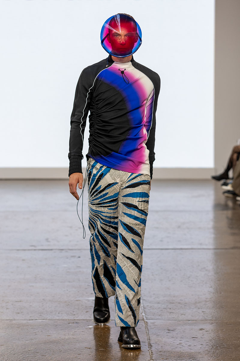 Yonghao Xie describe su estética como “oscura, auténtica y contemporánea”; y sus diseños están centrados en la deconstrucción técnica y los estampados. El resultado son diseños unisex de aspecto potente y sobre todo muy conceptual. En esta colección con la que se ha “presentado en sociedad”, el tema gira en torno al lado oscuro del entorno natural actual y el estatus social.