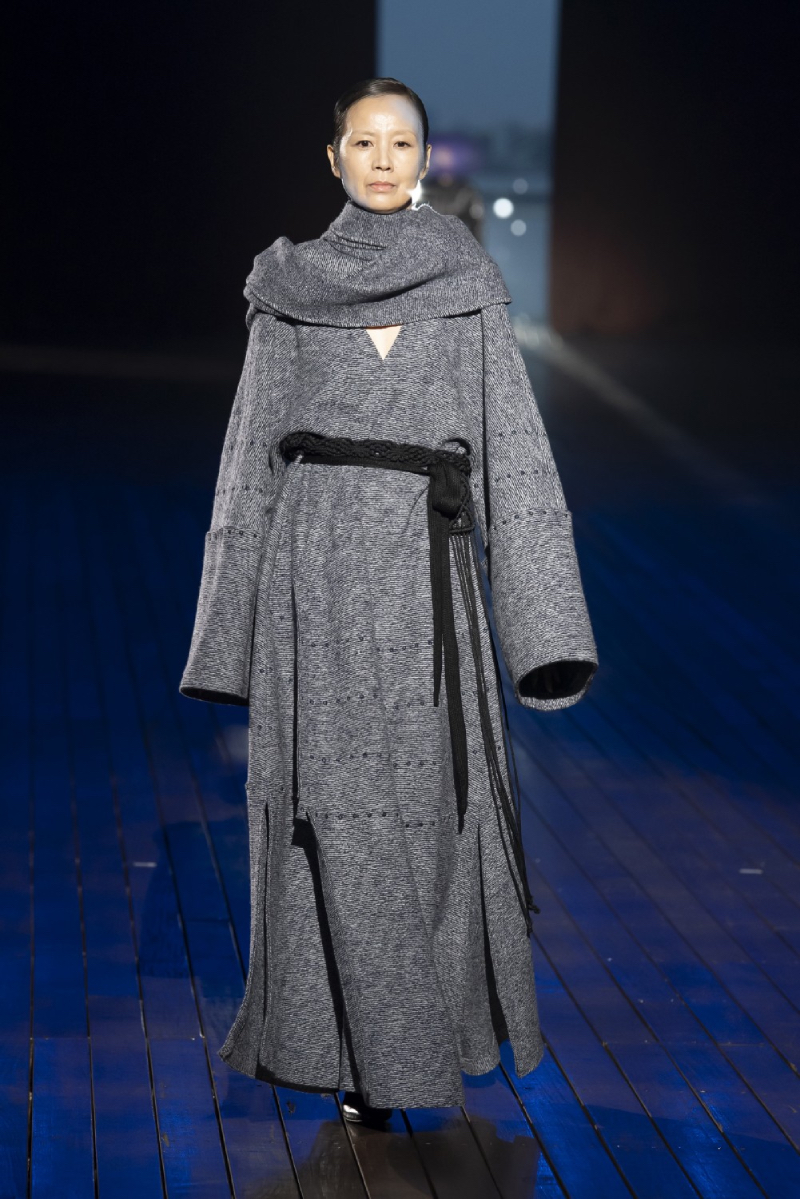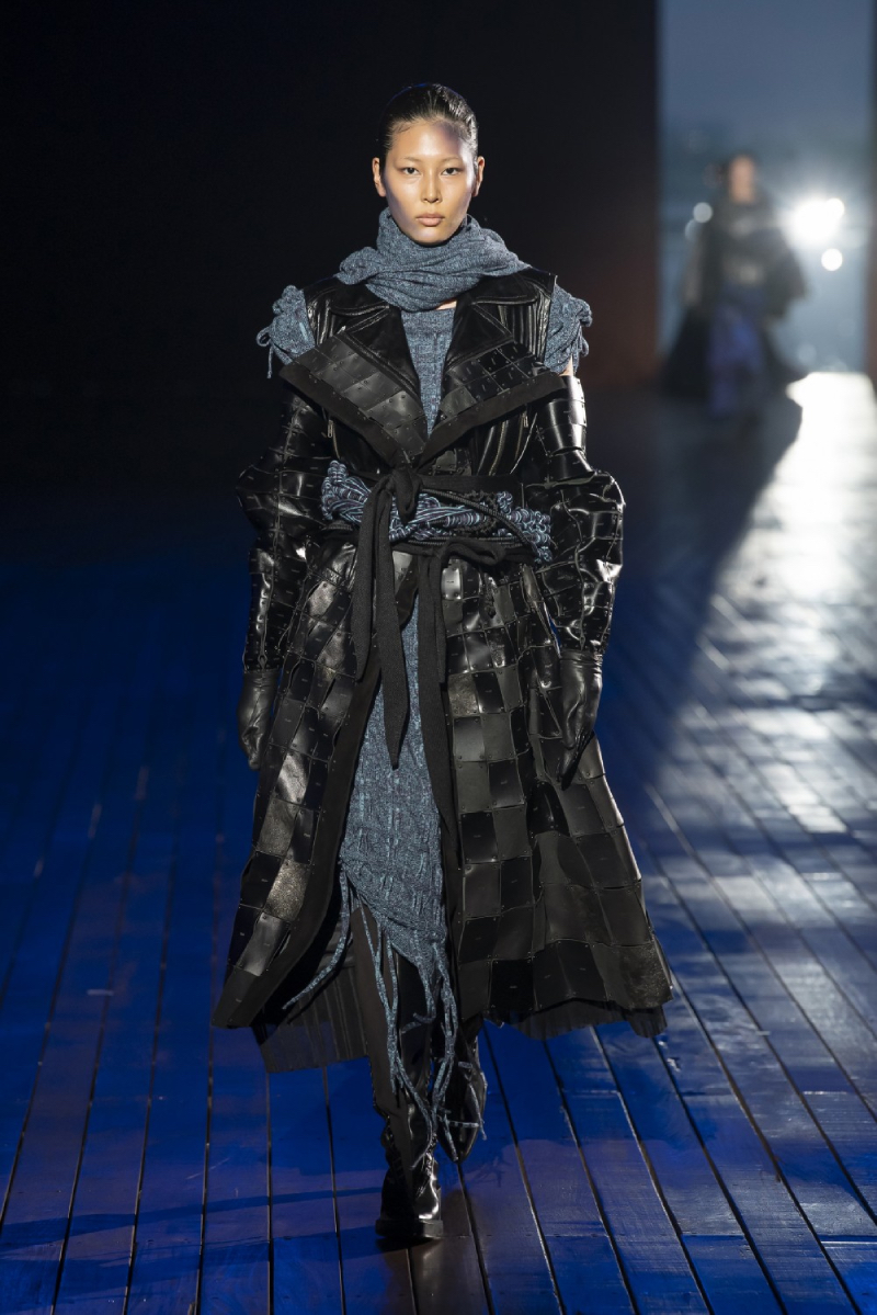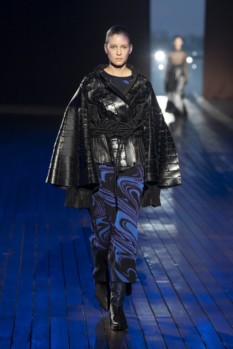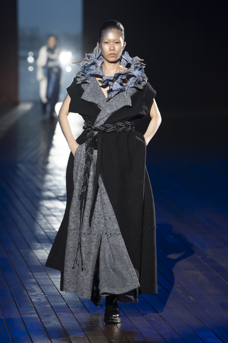 Los patrones de las prendas, como por ejemplo el de los kimonos, nacen de geometrías cuadradas para que funcionen en ambos géneros y en diferentes formas corporales. La clara estética a la moda tradicional japonesa también es otro de los elementos característicos de las prendas que nos recuerda a una versión de lo que Iris Van Herpen haría si se fijara en las profundidades de los océanos.