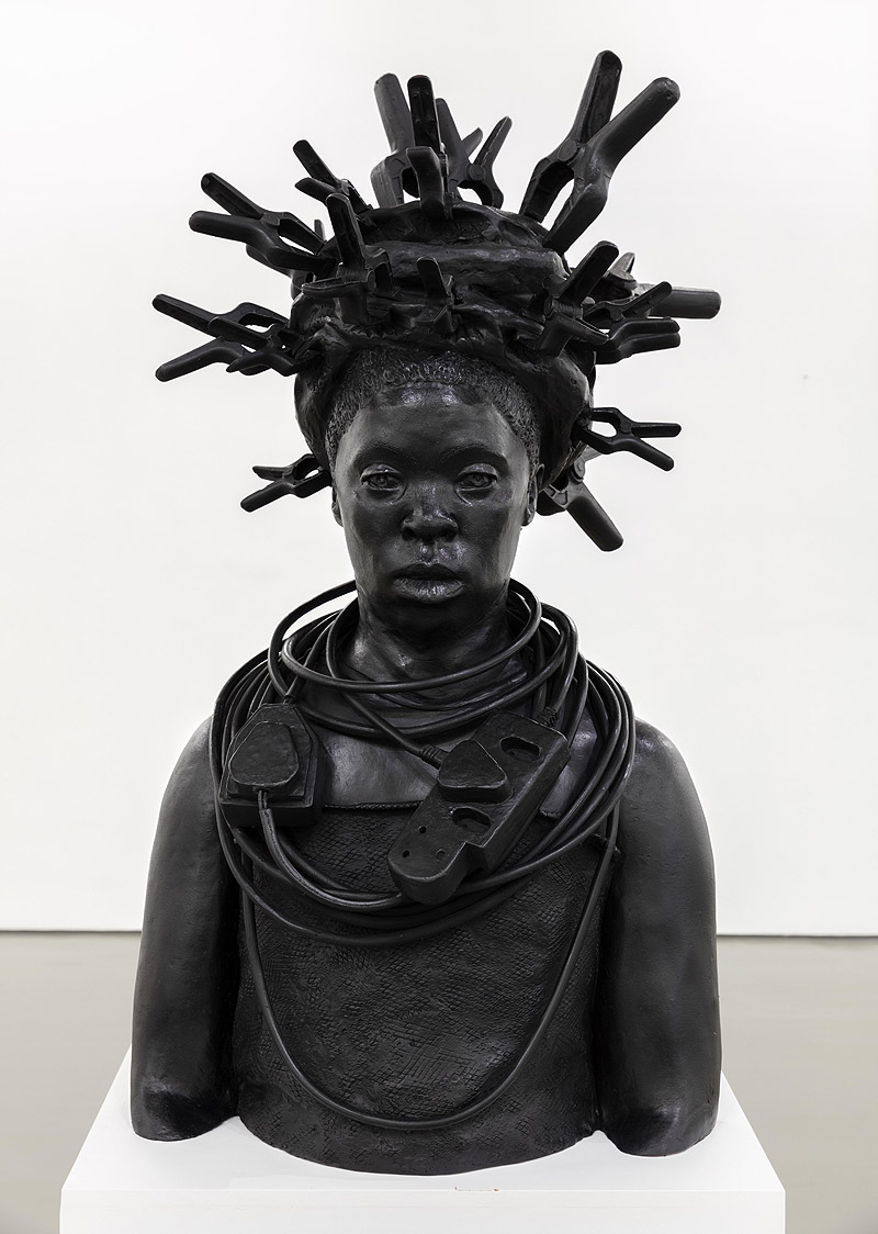 Durante la pandemia, Muholi extendió su práctica del autorretrato a nuevos medios, incluidas la pintura y la escultura. En sus pinturas, Muholi utiliza colores llamativos y patrones intrincados para investigar cuestiones relacionadas con la representación. “Zanele Muholi: Eye Me” también incluirá una escultura de bronce, un medio que históricamente se ha utilizado para conmemorar figuras de poder.