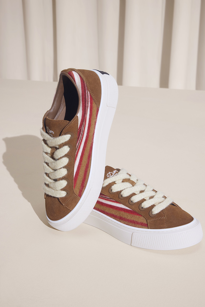 De los 7 colorways de los que podremos escoger, la Dior B33 en colaboración con Denim Tears se presenta en dos iteraciones, ambas en combinación con ante. La primera se trata de una versión en mohair con un patrón a rayas en los laterales de la zapatilla; versiones azules y marrones harán de grandes statement pieces. Si queréis algo más en línea con la estética de Dior; no os preocupéis. Las B33 de Dior Tears también se ofrecen en una versión más clásica, donde el jacquard con el estampado Dior Oblique sustituye al mohair rayado en combinaciones tonales perfectas para un look más clásico.