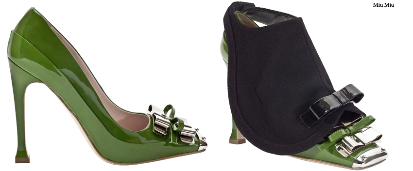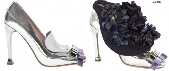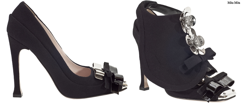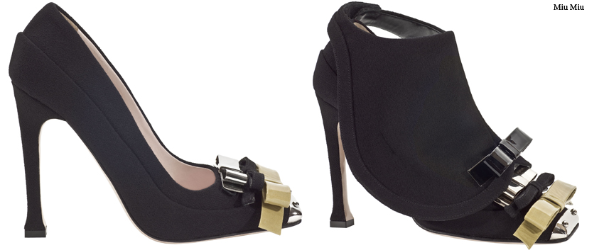 Con reminiscencias cincuenteras, tanto Miu Miu como Louis Vuitton presentan para esta temporada otoño invierno 10-11 una colección de zapatos de mujer con pajaritas en la puntera. Los modelos de Miu Miu se complementan con polainas opcionales a juego.