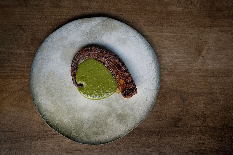 Los incondicionales de la cocina gallega sabrán apreciar el pulpo a la parrilla con chile pasilla y pipián verde, muy recomendado por el mismo Yahir quien confirma que sin tradición no hay modernidad. Nada más lujoso que el mismo chef prepare los chiles eligiendo entre diversas variedades de chiles frescos con distintos niveles de acidez, dando así a cada plato un equilibrio y complejidad que se perciben desde el primer bocado. El pulpo, del restaurante Zapote, con mole de pipián verde adquiere así una textura y un sabor que sólo se encuentran a un vuelo de distancia, y es que Yahir lleva a Galicia en el corazón.