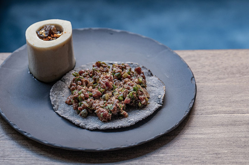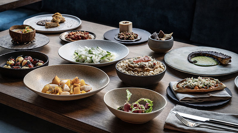 Más copiosas que unas tapas, las veinte opciones para elegir en formatos contemporáneos a menos de 20€, van desde brochetas al pastor a la parrilla con guacamole y salsa roja a un reconfortante cordero a la barbacoa con garbanzos picantes y tortillas. Veganos y vegetarianos tienen una decena de variantes, entre ellas la quesadilla de coliflor, endivias y salsa tomatillo o la berenjena ahumada con mole de setas salvajes y tamarindo, sublimes y todas con insumos locales.