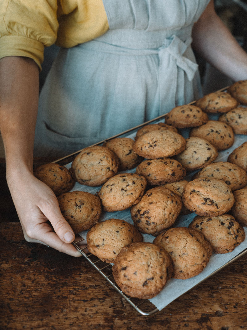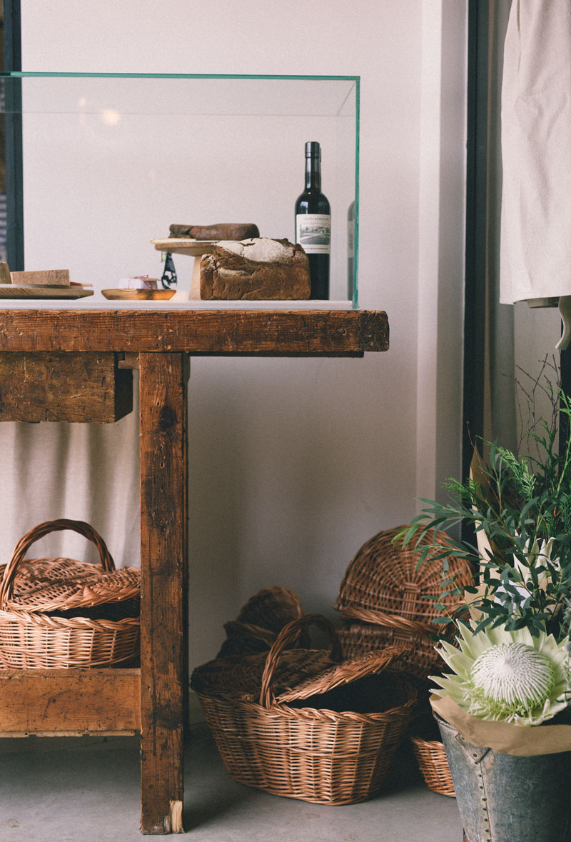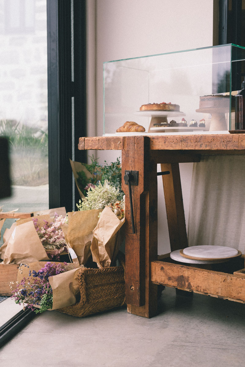 Con las puertas de cristal de la entrada abiertas se veía la tienda-obrador. Los ojos se nos van al mostrador de tartas, quesos, cestos, vinos y ramos de flores que descansan sobre un antiguo banco de carpintero que encontraron al llegar y que Roke restauró. A la derecha menaje de madera y terrazo, plantas y lámparas. Al fondo una sala ahogada en luz natural que quieren ir convirtiendo en pop-up. Parece que en esta casa han pasado el filtro estético por cada detalle. Aunque reducirlo a estético sería banal: en realidad cada detalle está perfectamente diseñado.