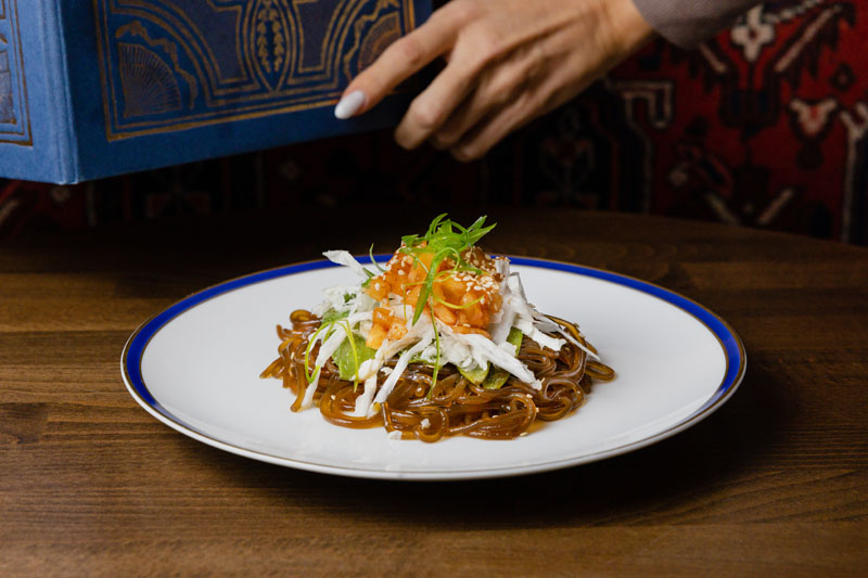 Noodles de Boniato con tirabeques y kimchi de nabo
