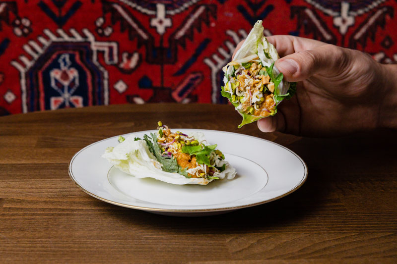Saam Coreano de paté de almendras, en hoja de shiso, con salsa de tamarindo y cacahuete